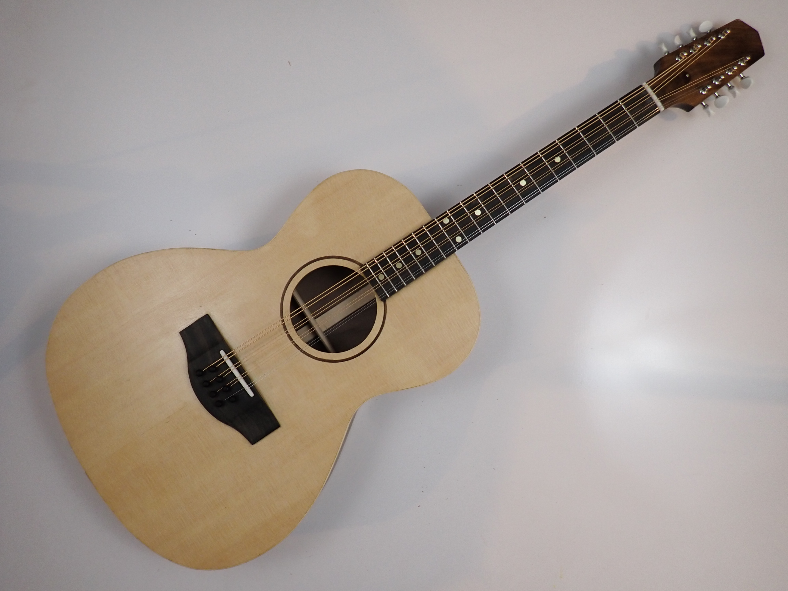 The neck is a soft V shape. The neck, sides, and back are walnut, the soundboard is Sitka spruce, the peghead overlay is walnut, the binding is curly maple, and the bridge pins, fretboard, and bridge are ebony. The fretboard and bridge have some light streaks in the ebony. The dots are brass, the nut and saddle are Corian, and the tuners are Gotohs. The finish is Tru Oil. The nut width is 1-1/2″ and the fretboard has a 7.25″ radius. I don’t have any mandolin playing skills but I hope the video will give some idea of the sound.