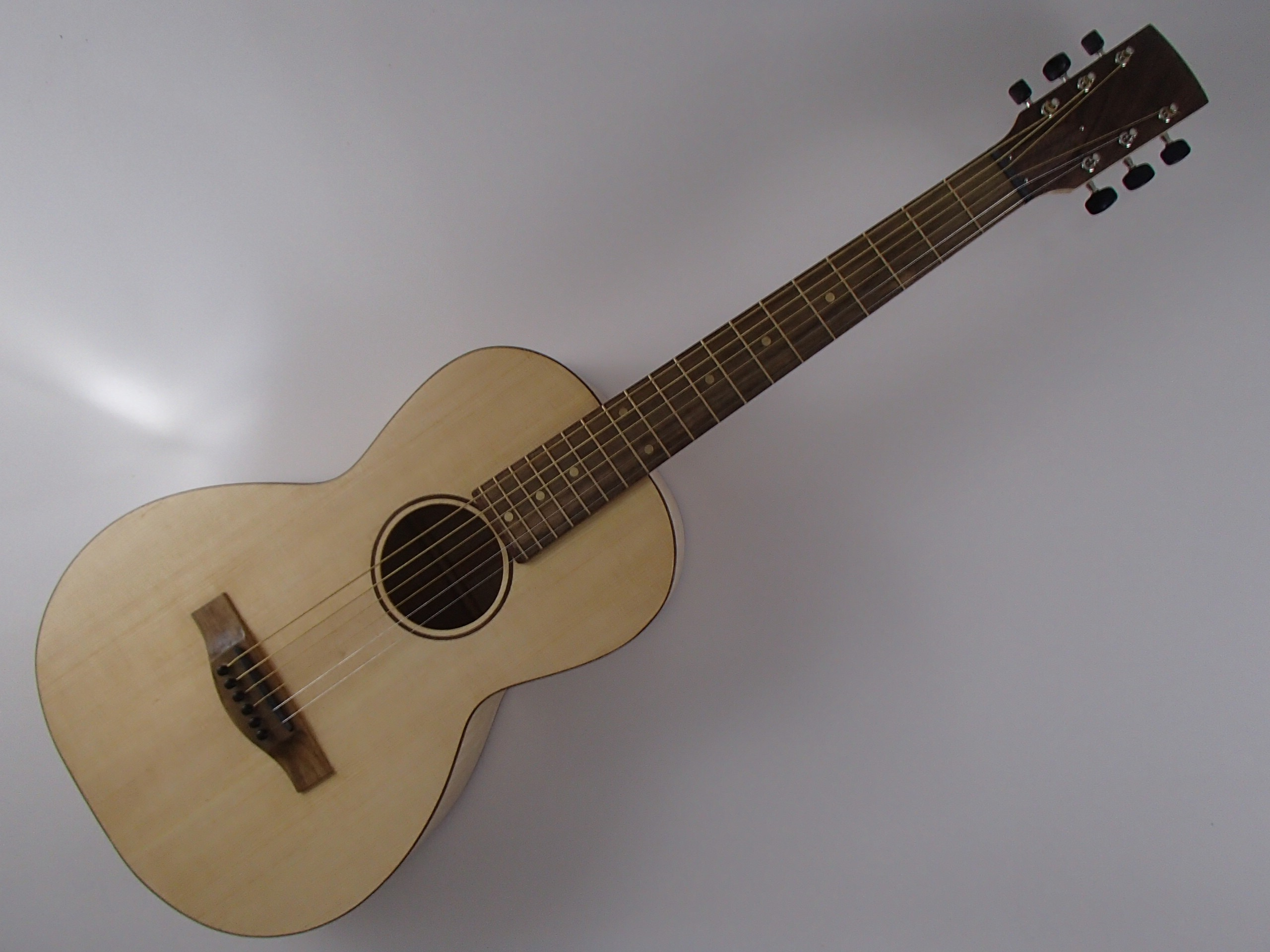 This is the third parlor guitar I have built to this design, but the first two were custom instruments and are shown in the Shop News from May 2018 and November 2019 instead of here on the Guitars page.  This guitar has curly maple back, sides, and neck, with walnut binding, headstock overlay, truss rod cover, and neck stripes, persimmon fretboard and bridge, and spruce soundboard.  The nut and saddle are Corian and the bridge pins are ebony.  These little guitars are surprisingly resonant and loud, more than I would have expected.   The nut width is 1-3/4″ and the scale length is 24-3/4″.  The dots are brass and the fret wire is EVO.  This guitar has walnut binding on the fretboard as well as on the body.  The neck stripe configuration is a new version for me, the center pinstripe is curly maple and the two wider stripes are walnut.  There is a two way truss rod in the neck.   To see a short video demo please click on the link below: