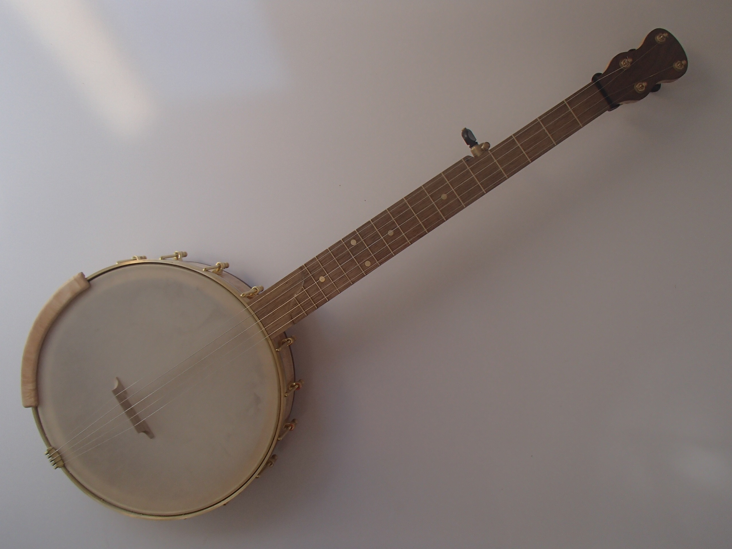 This banjo has a curly maple rim and neck with a persimmon fretboard and walnut trim. I will sell the banjo without the Romero-style armrest for $35 less if it isn’t wanted. This banjo has a Renaissance head on a 12″ block rim with a 3/16″ round brass tone hoop. The scale length is 25-1/2″ and the nut is 1-3/8″ wide. The neck has a two way truss rod accessed from the heel, brass dots, EVO fret wire, Gotoh tuners and Corian nuts. I made the Van Eps style tension hoop and the dowel stick yoke, the tailpiece and head came from Smakula Fretted Instruments and the rest of the hardware came from Balsam Banjo Works. The finish is Tru Oil. There is a brass plate on the dowel stick with the banjo number and such on it. The banjo is currently set up with a tall 5th string nut to raise the 5th close to the level of the other strings, but I can shorten the nut so the string rests on the 5th fret if desired. I can also add 5th string spikes for $5 each. To see a video of this banjo please follow the link below: