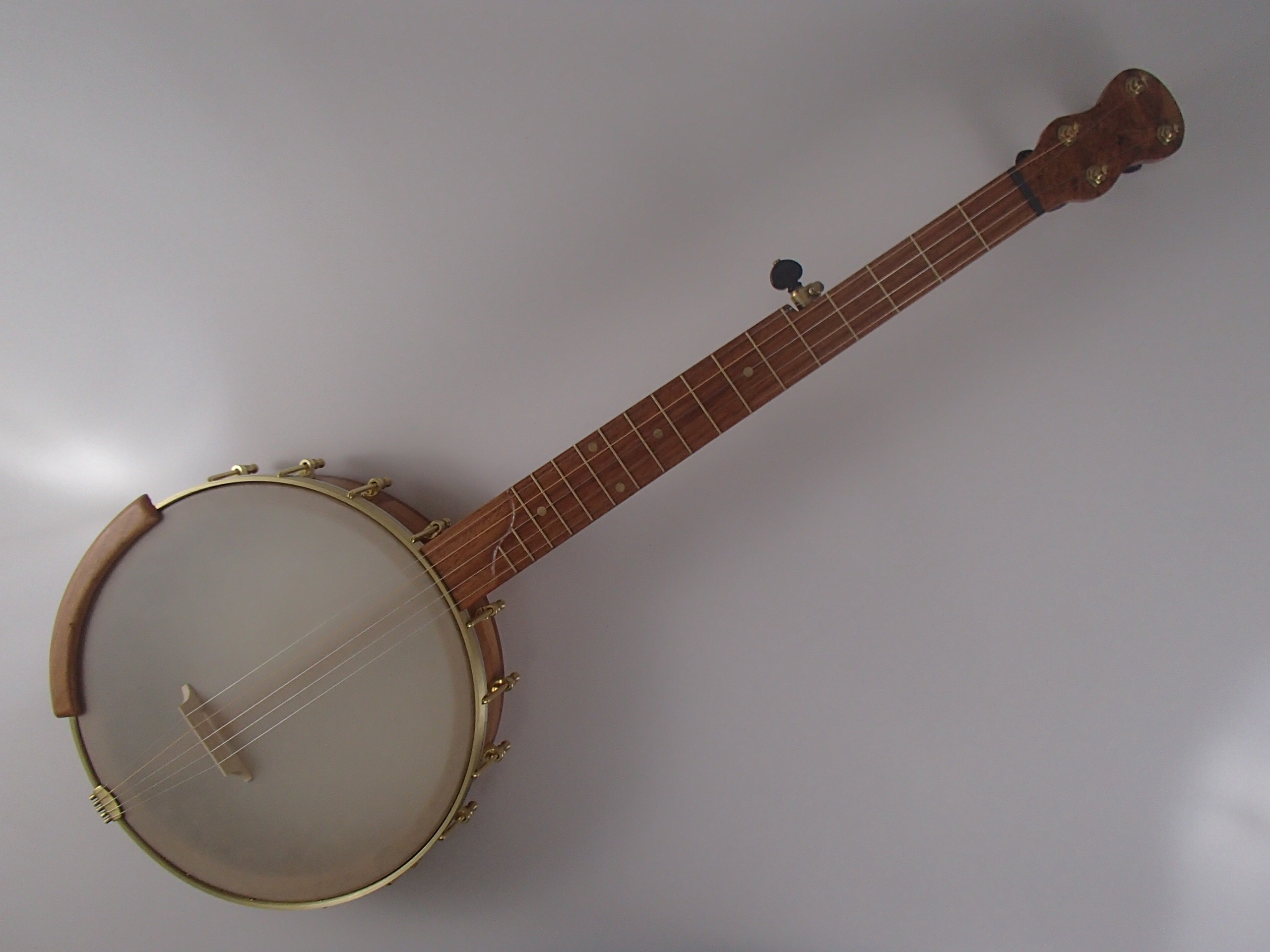 This banjo has a cherry rim, neck and Romero-style armrest, with a jatoba fretboard and heel cap, walnut neck stripe and cherry burl peghead overlay. I will sell the banjo without the armrest for $35 less if it isn’t wanted. This banjo has a Renaissance head on a 12″ block rim with a wood tone ring profile and a walnut rim cap. The scale length is 25-1/2″ and the nut is 1-3/8″ wide. The neck has a two way truss rod accessed from the heel, brass dots, EVO fret wire, Gotoh tuners and Corian nuts. I made the Van Eps style tension hoop and the dowel stick yoke, the tailpiece and head came from Smakula Fretted Instruments and the rest of the hardware came from Balsam Banjo Works. The finish is Tru Oil. There is a brass plate on the dowel stick with the banjo number and such on it. The banjo is currently set up with a tall 5th string nut to raise the 5th to the level of the other strings, but I can shorten the nut so the string rests on the 5th fret if desired. I can also add 5th string spikes for $5 each. If you would prefer a Fiberskyn head I can install one at no extra cost. To see a video demonstration of this banjo please follow the link below.