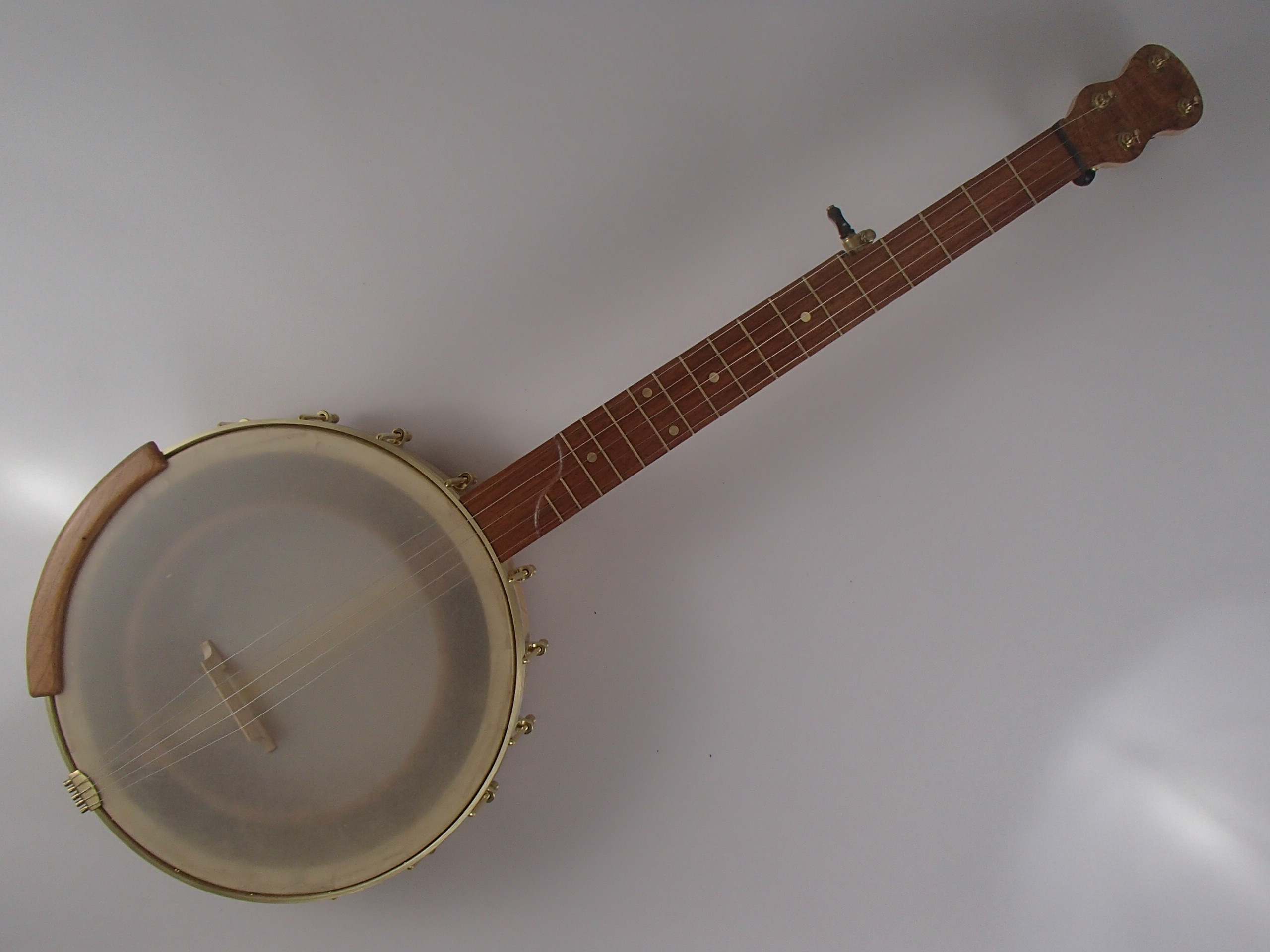 This banjo has a curly ash rim and neck, a cherry internal resonator and Romero-style armrest, cherry burl peghead overlay and heel cap, and jatoba fretboard. I will sell the banjo without the armrest for $30 less. This banjo has a Renaissance head on a 12″ block rim with wood tone ring profile and an internal resonator. The scale length is 25-1/2″ and the nut is 1-3/8″ wide. The neck has a two way truss rod accessed from the heel, brass dots, EVO fret wire, Gotoh tuners and Corian nuts. I made the Van Eps style tension hoop, the tone ring and the dowel stick yoke, the tailpiece and head came from Smakula Fretted Instruments and the rest of the hardware came from Balsam Banjo Works. The finish is Tru Oil. There is a brass plate on the dowel stick with the banjo number and such on it. The banjo is currently set up with a tall 5th string nut to raise the 5th to the level of the other strings, but I can shorten the nut so the string rests on the 5th fret if desired. I can also add 5th string spikes for $5 each. If you want a case with this banjo I can ship it in a Superior bump case, model CD-1536, for $140. To see a video of this banjo please follow the link below:
