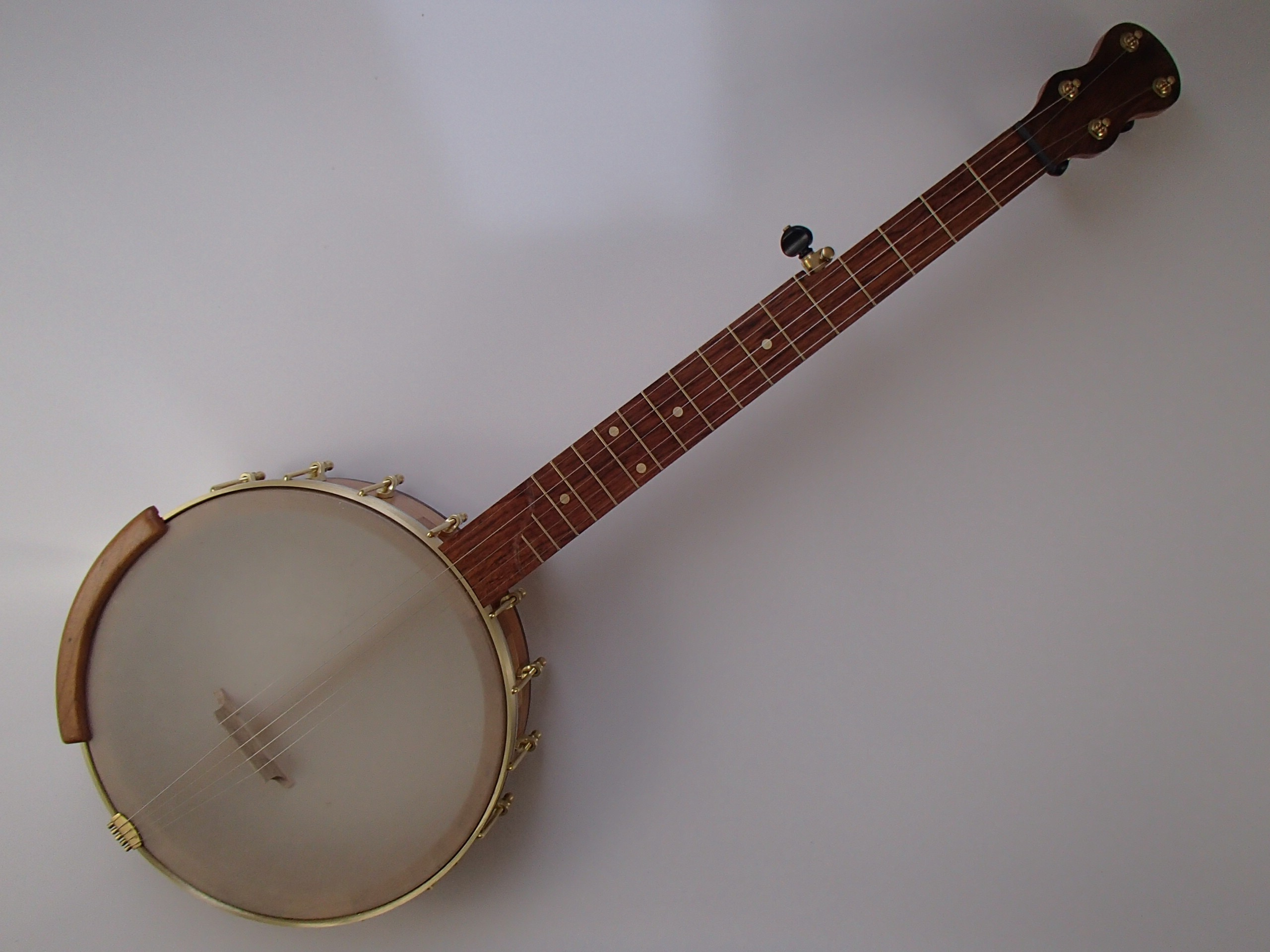This banjo has a cherry rim, neck and Romero-style armrest, with a jatoba fretboard, walnut neck stripe, heel cap, rim cap and peghead overlay. I will sell the banjo without the armrest for $30 less. This banjo has a Renaissance head on a 12″ block rim, 5/8″ thick, with a wood tone ring profile. The scale length is 25-1/2″ and the nut is 1-3/8″ wide. The neck has a two way truss rod accessed from the heel, brass dots, EVO fret wire, Gotoh tuners and Corian nuts. I made the Van Eps style tension hoop and the dowel stick yoke, the tailpiece and head came from Smakula Fretted Instruments and the rest of the hardware came from Balsam Banjo Works. The finish is Tru Oil. There is a brass plate on the dowel stick with the banjo number and such on it. The banjo is currently set up with a tall 5th string nut to raise the 5th to the level of the other strings, but I can shorten the nut so the string rests on the 5th fret if desired. I can also add 5th string spikes for $5 each. If you would prefer a Fiberskyn head I can install one at no extra cost. To see a video demonstration of this banjo please follow the link below.