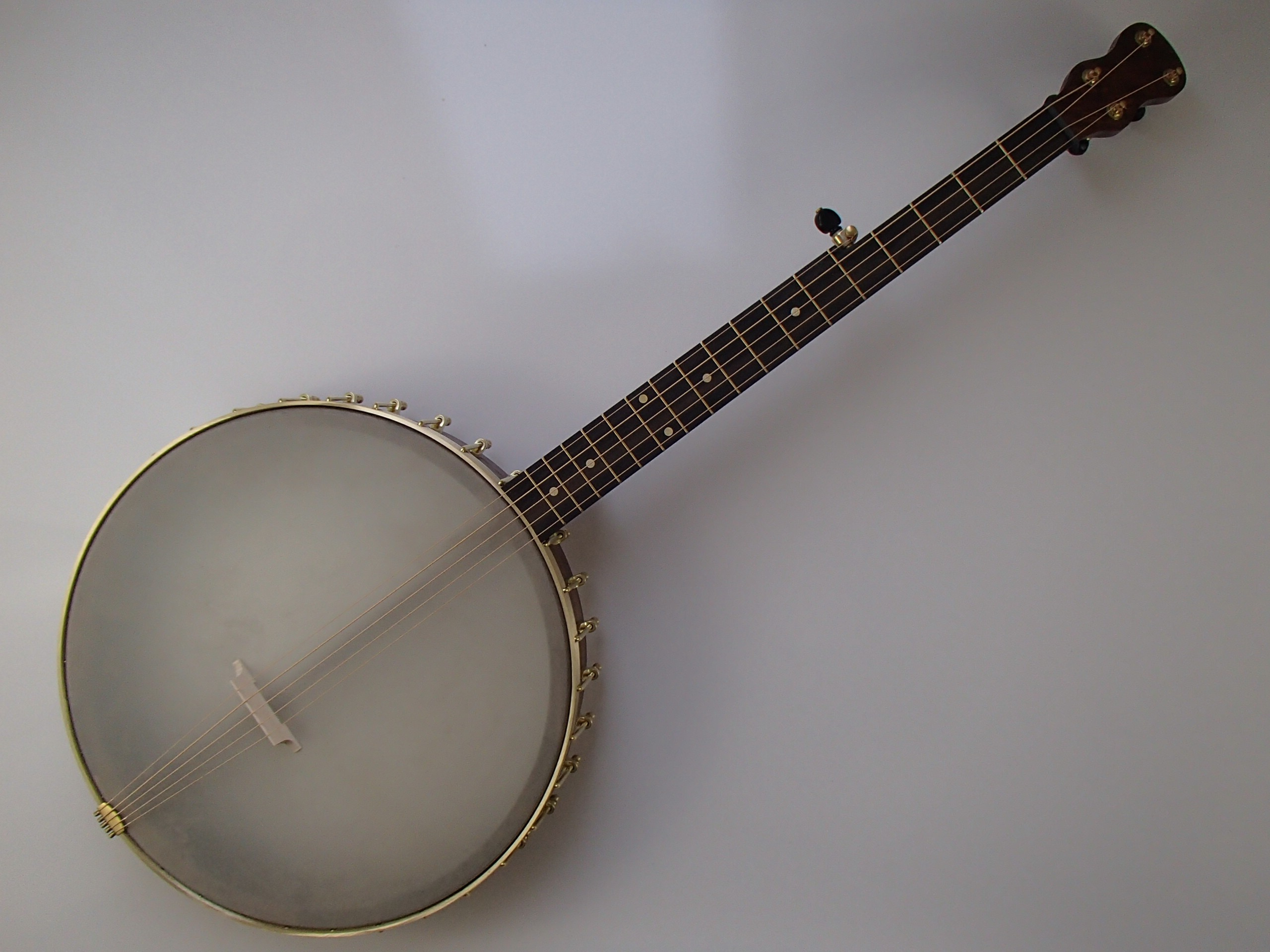 This is my sixth cello banjo, made from walnut with a slightly streaky ebony fretboard. The scale length is 29 inches and the rim diameter is 16 inches. The nut width is 1-3/8″ and there is a two way truss rod in the neck. The head is a Remo Renaissance which the fine folks at Smakula Fretted Instruments kindly ordered for me. This banjo is set up with steel strings, the gauges are .024w, .046w, .032w, .028w .024w. It has Gotoh raw brass tuners, EVO fret wire and Corian nuts. The pot has 34 brackets. I made the brass Van Eps style tension hoop and the dowel stick yoke, the rest of the hardware came from Balsam Banjo Works except the tailpiece which is also from Smakula. This banjo weighs approximately 7 pounds 7 ounces, and is about 41″ in overall length.