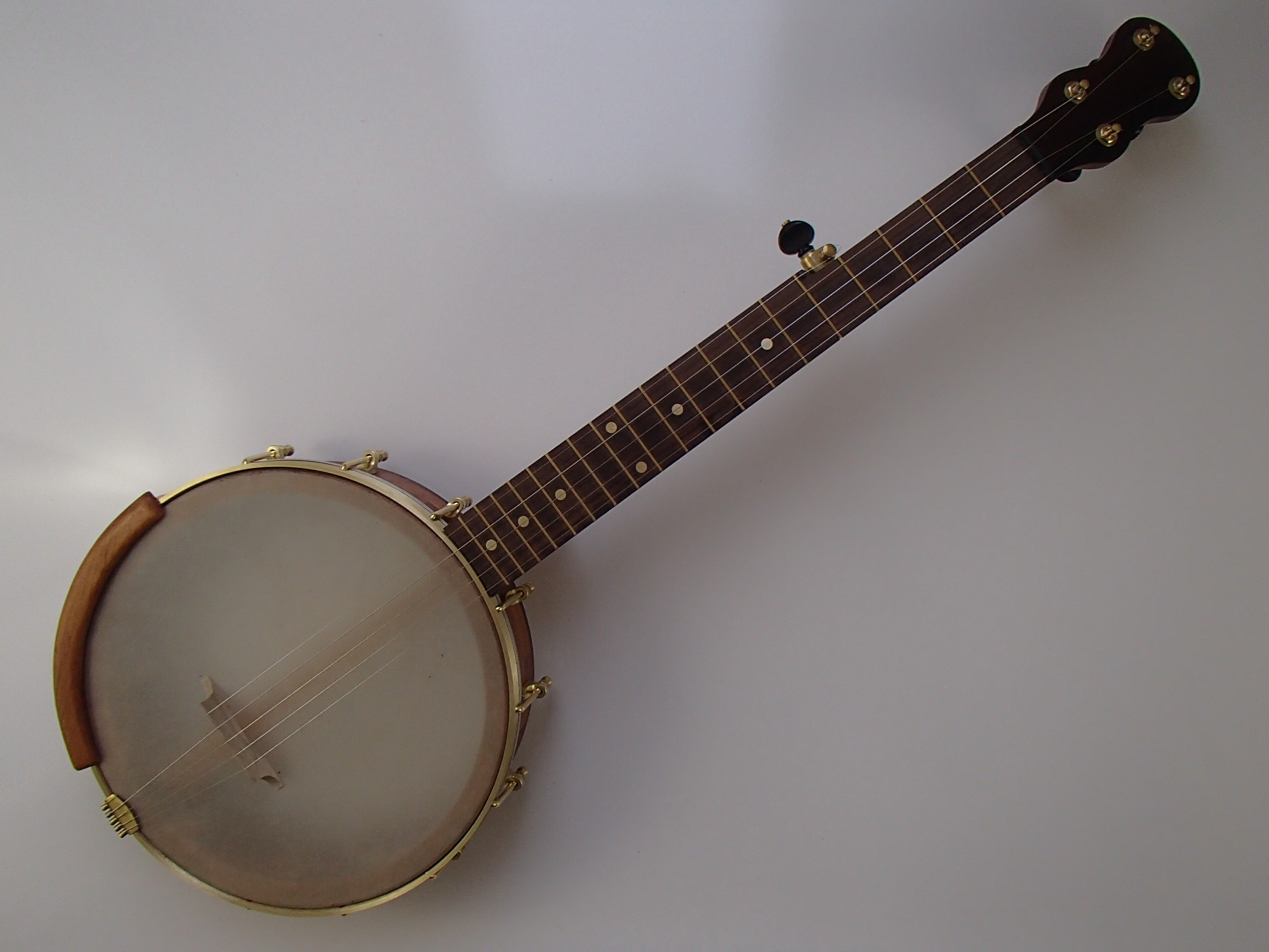 This is my second mahogany A scale banjo. The neck, rim, and Romero-style armrest are made from African mahogany (khaya family) with a rosewood peghead overlay and fretboard and a walnut rim cap. If you don’t want the armrest let me know and I’ll take it off and lower the price by $35. The tuners are made by Gotoh, the frets are EVO and the nuts are Corian. The scale length is 23″ and the nut width is 1-3/8″. There is a two way truss rod accessed at the heel of the neck. I made the Van Eps style tension hoop and the dowel stick brace, the Renaissance head and the tailpiece came from Smakula Fretted Instruments, and the rest of the hardware is from Balsam Banjo Works. The finish is Tru Oil. I can put a Fiberskyn head on instead at no extra charge, if you’d prefer that just let me know. I can install 5th string spikes for $5 each. To see a short video demonstration of this banjo please follow the link below.