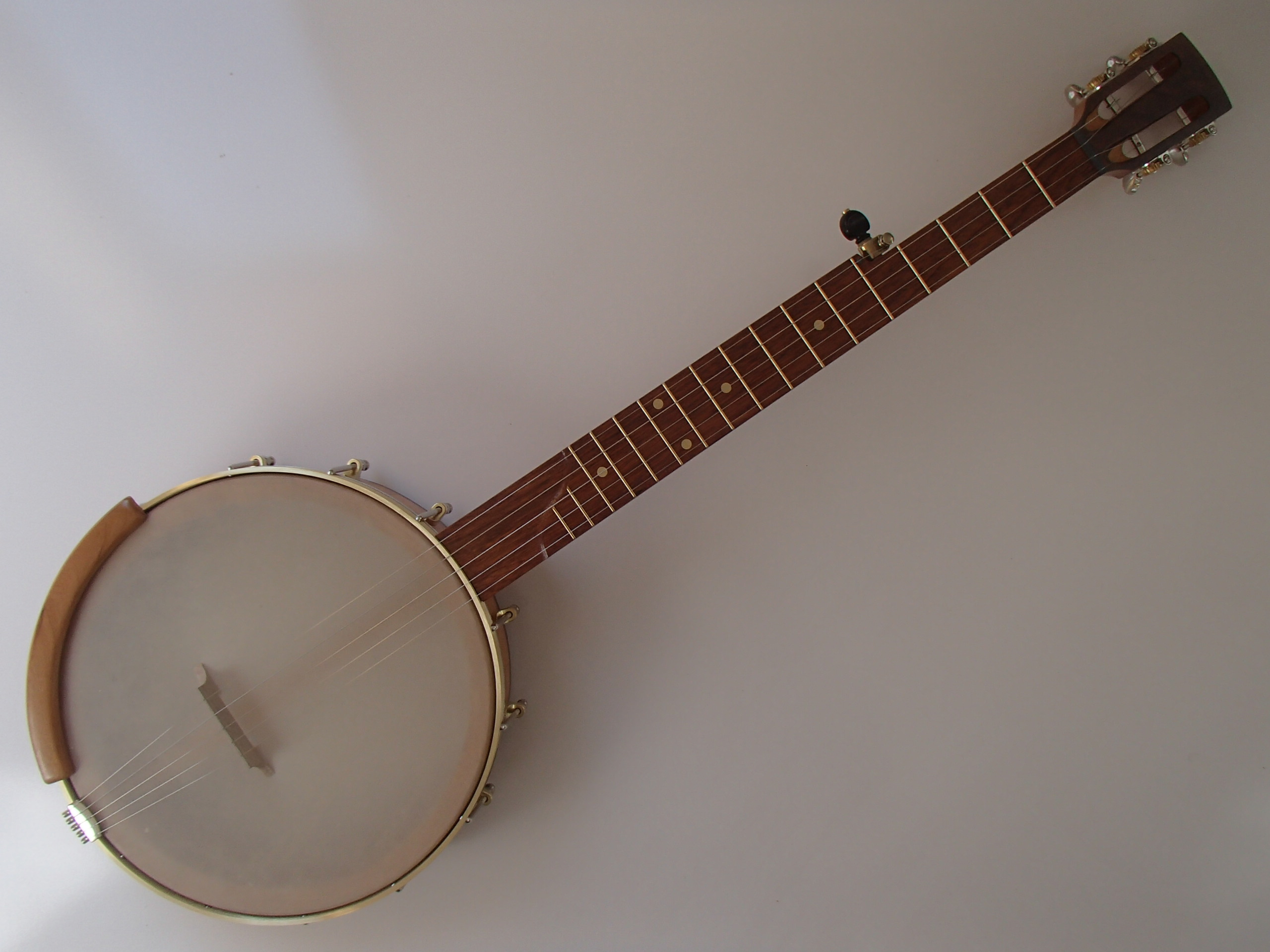 After I made my last slot head banjo I received a couple of inquiries about a banjo with a slot head and a standard 5th string tuner, one of which led to a custom build in January, so that is how I made this one.  This banjo is cherry with a walnut peghead overlay, rim cap and heel cap and a jatoba fretboard.  I will sell it without the Romero-style armrest for $895, just let me know.  The rim is 11″ with a wood tone ring profile, the scale length is 25.5″ and the nut width is 1-3/8″. It has Grover 18-1 Sta-Tite tuners at the peghead, a Gotoh 5th string tuner, and a two way truss rod in the neck, accessed at the heel.  The fret wire is EVO, the dots are brass, and the nuts are Corian.  The Renaissance head and No-Knot tailpiece came from Samkula Fretted Instruments, I made the dowel stick yoke and Van Eps style tension hoop myself and the rest of the hardware came from Balsam Banjo Works.  The shoes are brass and the hooks and nuts are nickel plated.  There is a brass plate on the dowel stick with my name, the town and year of production and the banjo number on it.  I can install a Fiberskyn head on this banjo at no cost, and I can put in fretboard spikes for $5 each.  To see a short video demo please follow the link below: