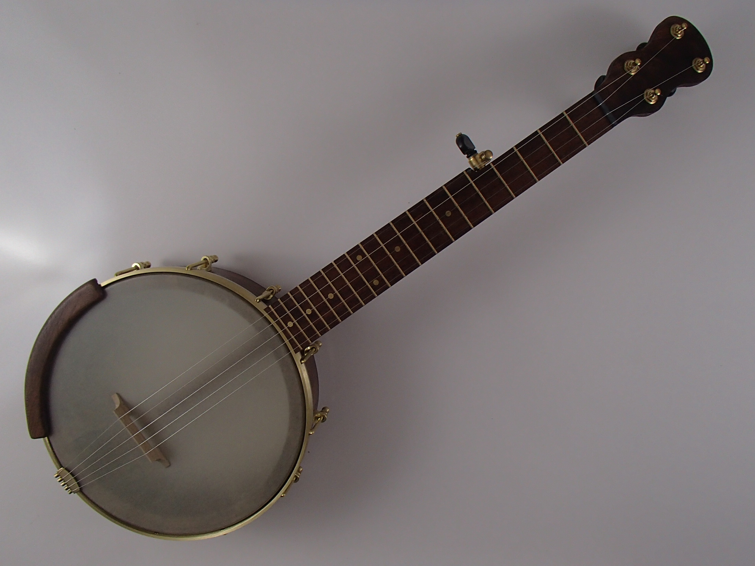 This banjo has a walnut rim, neck and Romero-style armrest, with a curly walnut peghead overlay and granadillo fretboard. I will sell the banjo without the armrest for $35 less if it isn’t wanted. This banjo has a Renaissance head on a 10″ block rim with a wood tone ring profile and a walnut rim cap. The scale length is 19-3/4″ and the nut is 1-3/8″ wide. The neck has a two way truss rod accessed from the heel, brass dots, EVO fret wire, Gotoh tuners and Corian nuts. I made the Van Eps style tension hoop and the dowel stick yoke, the tailpiece and head came from Smakula Fretted Instruments and the rest of the hardware came from Balsam Banjo Works. The finish is Tru Oil. There is a brass plate on the dowel stick with the banjo number and such on it. The banjo is currently set up with a tall 5th string nut to raise the 5th to the level of the other strings, but I can shorten the nut so the string rests on the 5th fret if desired. I can also add 5th string spikes for $5 each. The banjo is tuned to open C in the video, but it will also tune comfortably down to open A with the stock Martin medium strings. To see a video of this banjo please follow the link below: