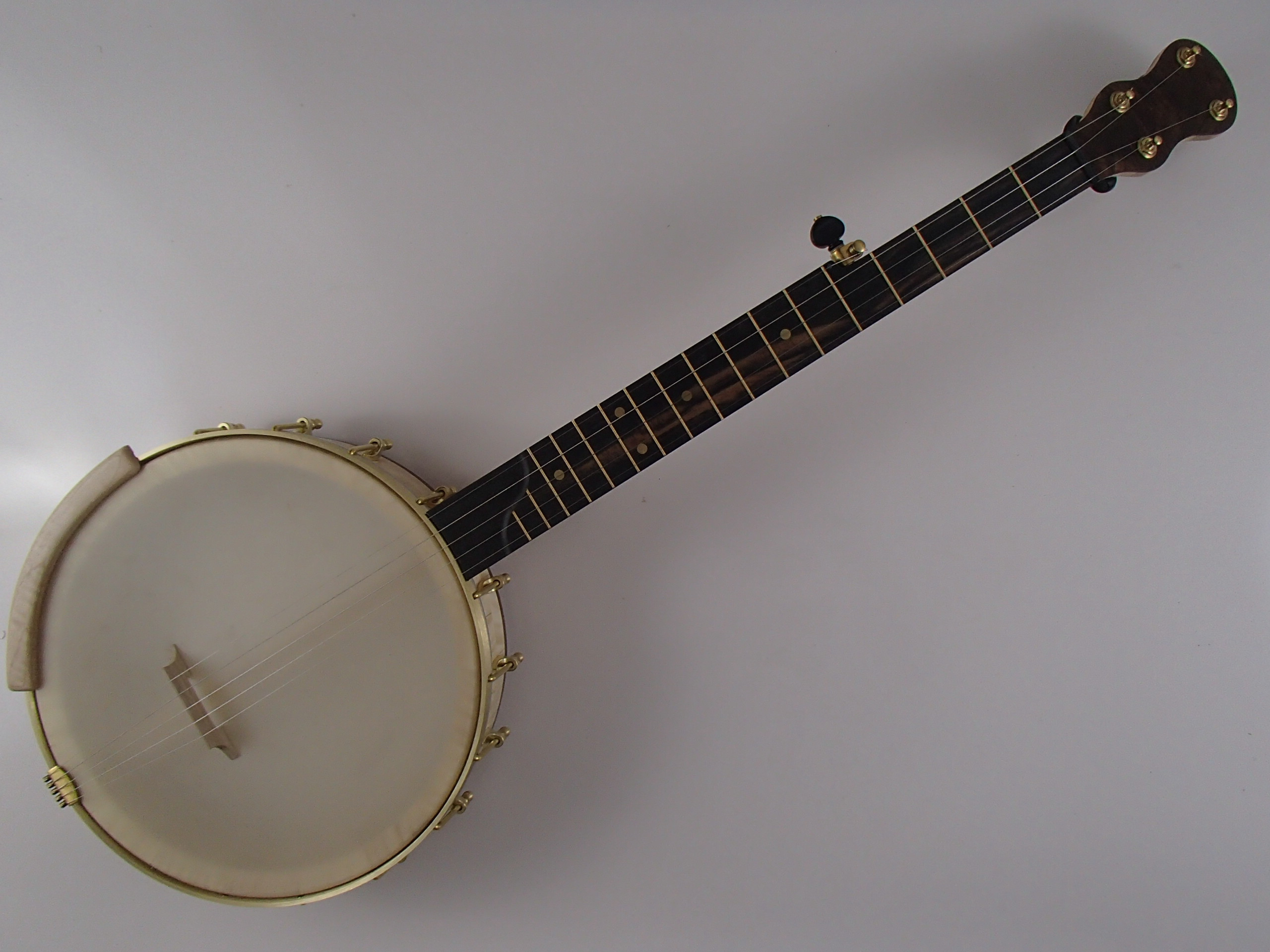 This banjo has a curly maple rim, neck and armrest with a streaky ebony fretboard and walnut trim. I will sell the banjo without the Romero-style armrest for $35 less if it isn’t wanted. This banjo has a Renaissance head on a 12″ block rim with a wood tone ring profile. The scale length is 25-1/2″ and the nut is 1-3/8″ wide. The neck has a two way truss rod accessed from the heel, brass dots, EVO fret wire, Gotoh tuners and Corian nuts. I made the Van Eps style tension hoop and the dowel stick yoke, the tailpiece and head came from Smakula Fretted Instruments and the rest of the hardware came from Balsam Banjo Works. The finish is Tru Oil. There is a brass plate on the dowel stick with the banjo number and such on it. The banjo is currently set up with a tall 5th string nut to raise the 5th close to the level of the other strings, but I can shorten the nut so the string rests on the 5th fret if desired. I can also add 5th string spikes for $5 each. To see a video of this banjo please follow the link below: