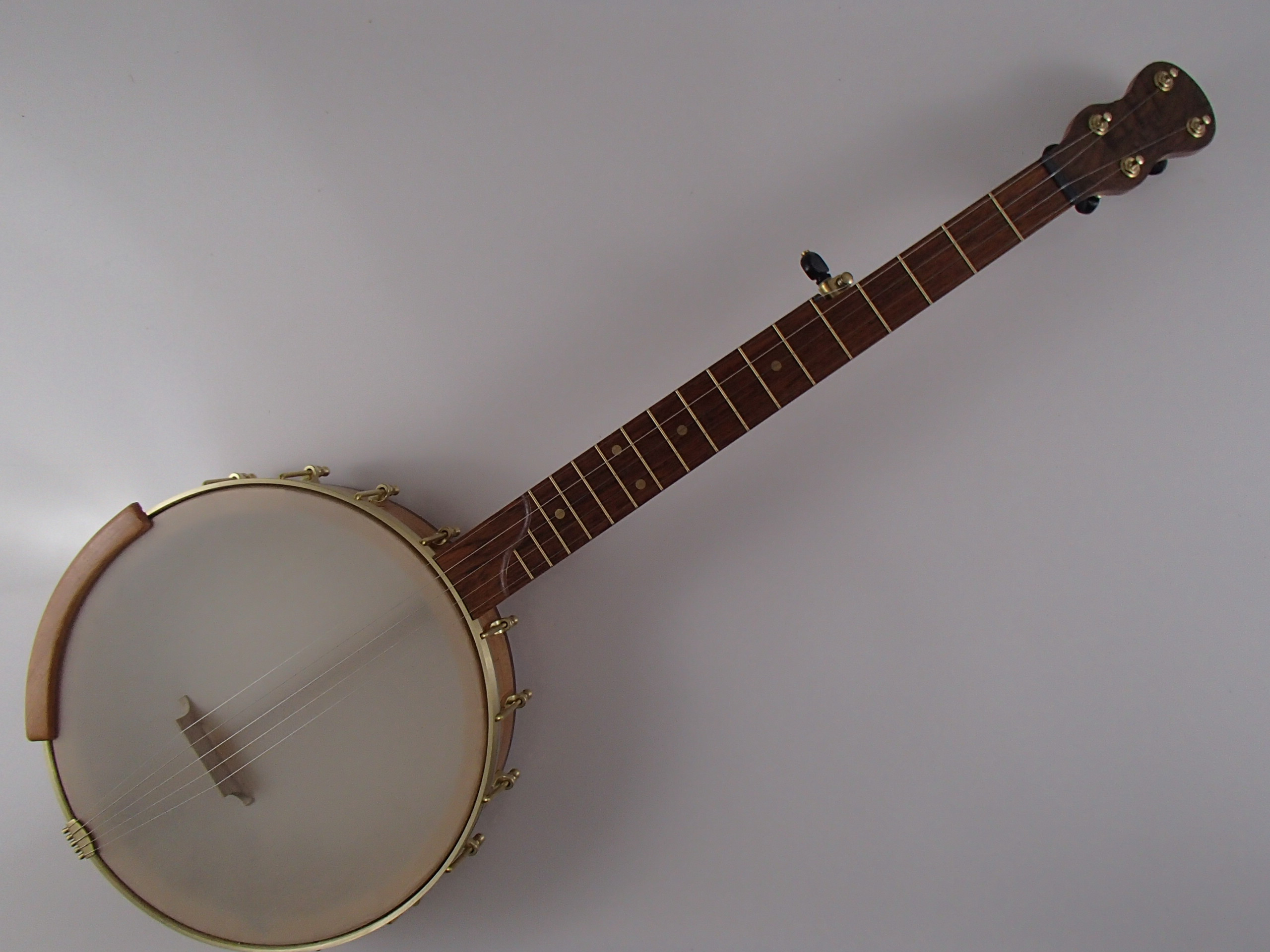 This banjo has a cherry rim, neck and Romero-style armrest, with a jatoba fretboard, and walnut neck stripe, heel cap, rim cap and peghead overlay. I will sell the banjo without the armrest for $30 less. This banjo has a Renaissance head on a 12″ block rim, 5/8″ thick, with a wood tone ring profile. The scale length is 25-1/2″ and the nut is 1-3/8″ wide. The neck has a two way truss rod accessed from the heel, brass dots, EVO fret wire, Gotoh tuners and Corian nuts. I made the Van Eps style tension hoop and the dowel stick yoke, the tailpiece and head came from Smakula Fretted Instruments and the rest of the hardware came from Balsam Banjo Works. The finish is Tru Oil. There is a brass plate on the dowel stick with the banjo number and such on it. The banjo is currently set up with a tall 5th string nut to raise the 5th to the level of the other strings, but I can shorten the nut so the string rests on the 5th fret if desired. I can also add 5th string spikes for $5 each. If you would prefer a Fiberskyn head I can install one at no extra cost. To see a video demonstration of this banjo please follow the link below: