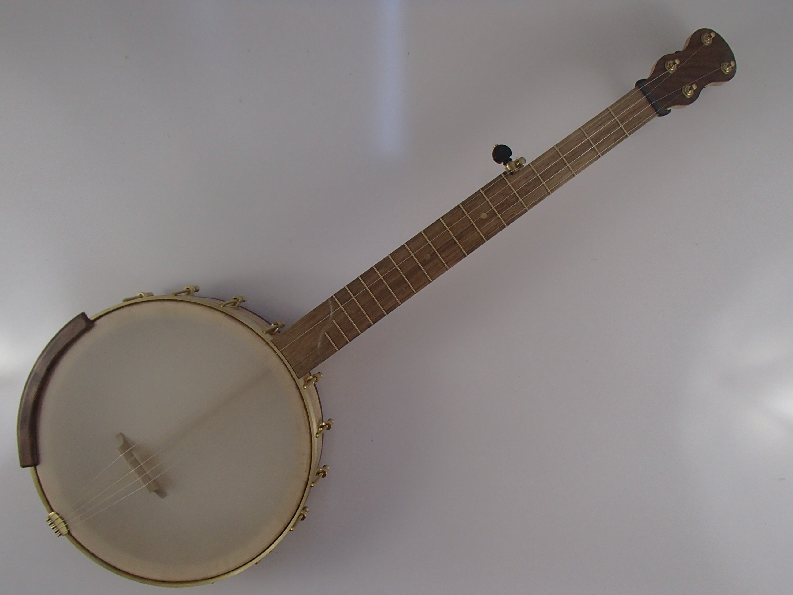 This banjo has a curly maple rim, neck and armrest with a persimmon fretboard and walnut trim. I will sell the banjo without the Romero-style armrest for $35 less if it isn’t wanted. This banjo has a Renaissance head on a 12″ block rim with a wood tone ring profile. The scale length is 25-1/2″ and the nut is 1-3/8″ wide. The neck has a two way truss rod accessed from the heel, brass dots, EVO fret wire, Gotoh tuners and Corian nuts. I made the Van Eps style tension hoop and the dowel stick yoke, the tailpiece and head came from Smakula Fretted Instruments and the rest of the hardware came from Balsam Banjo Works. The finish is Tru Oil. There is a brass plate on the dowel stick with the banjo number and such on it. The banjo is currently set up with a tall 5th string nut to raise the 5th close to the level of the other strings, but I can shorten the nut so the string rests on the 5th fret if desired. I can also add 5th string spikes for $5 each. If you want a case with this banjo I can ship it in a Superior bump case, model CD-1536, for $140. To see a video of this banjo please follow the link below: