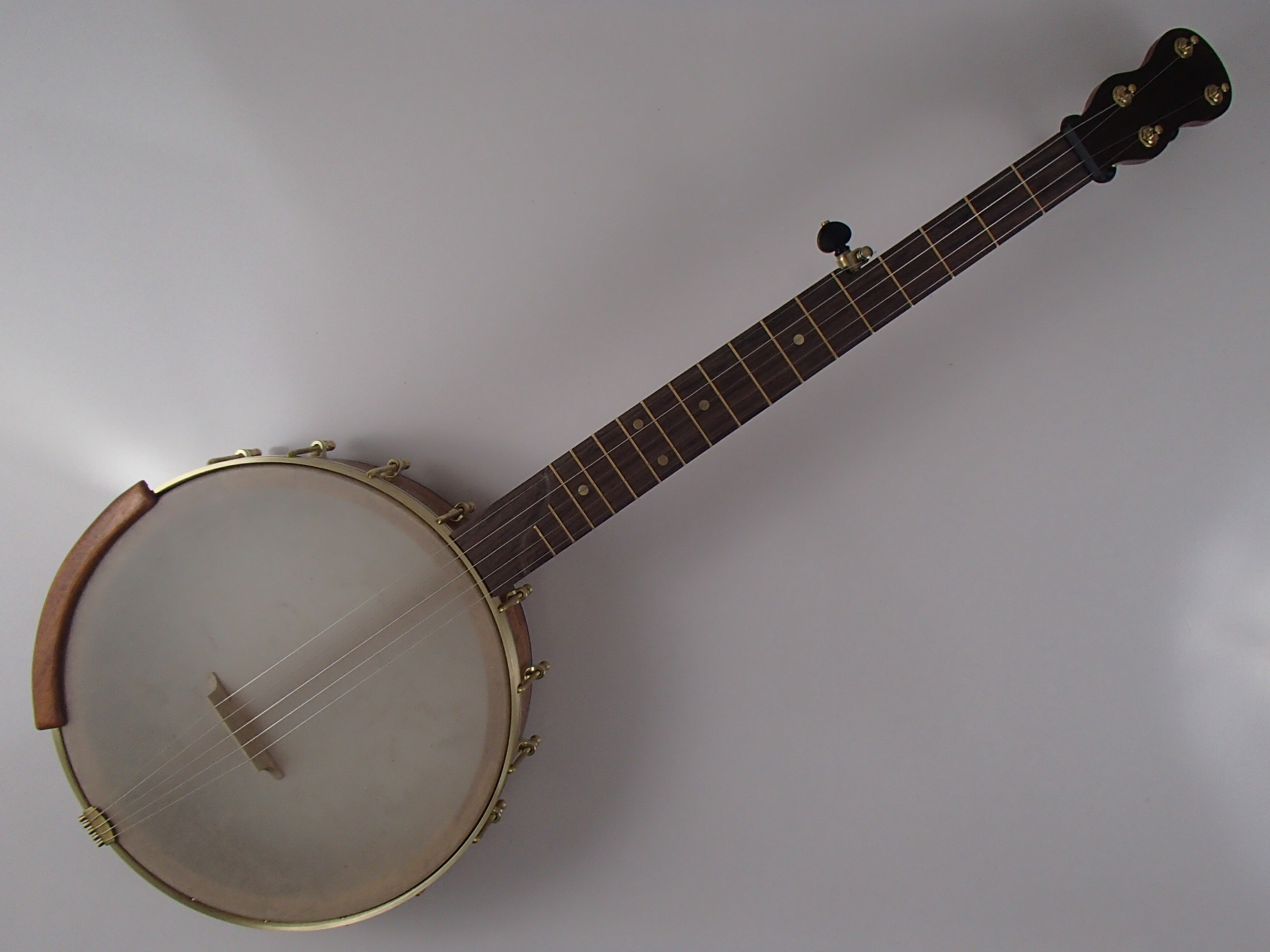 This banjo has a mahogany rim, neck and Romero-style armrest, with a rosewood fretboard, rim cap, heel cap and peghead overlay. I will sell the banjo without the armrest for $35 less if it isn’t wanted. This banjo has a Renaissance head on a 12″ block rim with a wood tone ring profile. The scale length is 25-1/2″ and the nut is 1-3/8″ wide. The neck has a two way truss rod accessed from the heel, brass dots, EVO fret wire, Gotoh tuners and Corian nuts. I made the Van Eps style tension hoop and the dowel stick yoke, the tailpiece, tuners and head came from Smakula Fretted Instruments and the rest of the hardware came from Balsam Banjo Works. The finish is Tru Oil. There is a brass plate on the dowel stick with the banjo number and such on it. The banjo is currently set up with a tall 5th string nut to raise the 5th to the level of the other strings, but I can shorten the nut so the string rests on the 5th fret if desired. I can also add 5th string spikes for $5 each. If you would prefer a Fiberskyn head I can install one at no extra cost. If you want a case with this banjo I can ship it in a Superior bump case, model CD-1536, for $140. To see a video demonstration of this banjo please follow the link below.
