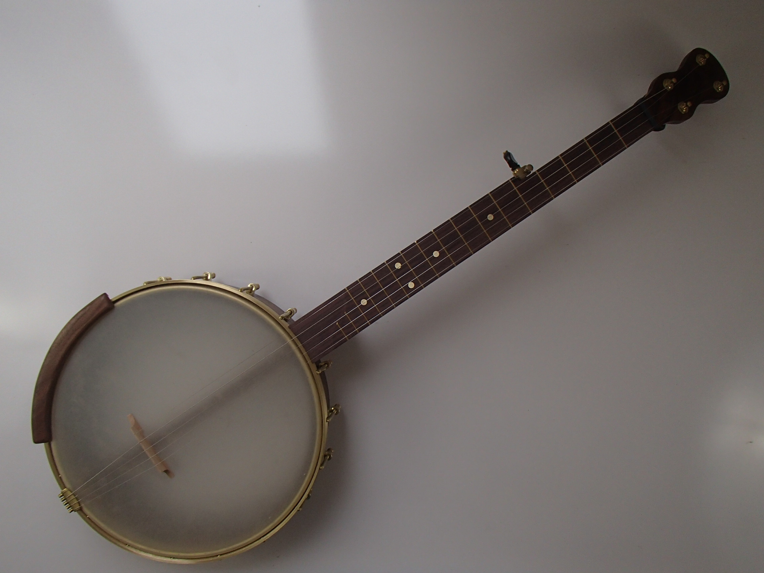 This banjo has a walnut rim, neck and Romero-style armrest, with a rosewood fretboard and a curly walnut peghead overlay. I will sell the banjo without the armrest for $35 less if it isn’t wanted. This banjo has a Renaissance head on a 12″ block rim with a brass Whyte Laydie/Electric type tone ring and a walnut rim cap. The scale length is 25-1/2″ and the nut is 1-3/8″ wide. The neck has a two way truss rod accessed from the heel, brass dots, EVO fret wire, Gotoh tuners and Corian nuts. I made the Van Eps style tension hoop and the dowel stick yoke, the tailpiece, tuners and head came from Smakula Fretted Instruments and the rest of the hardware came from Balsam Banjo Works. The finish is Tru Oil. There is a brass plate on the dowel stick with the banjo number and such on it. The banjo is currently set up with a tall 5th string nut to raise the 5th to the level of the other strings, but I can shorten the nut so the string rests on the 5th fret if desired. I can also add 5th string spikes for $5 each. If you would prefer a Fiberskyn head I can install one at no extra cost. If you want a case with this banjo I can ship it in a Superior bump case, model CD-1536, for $150. To see a video demonstration of this banjo and #195 which is similar but has a wood tone ring profile please follow the link below.