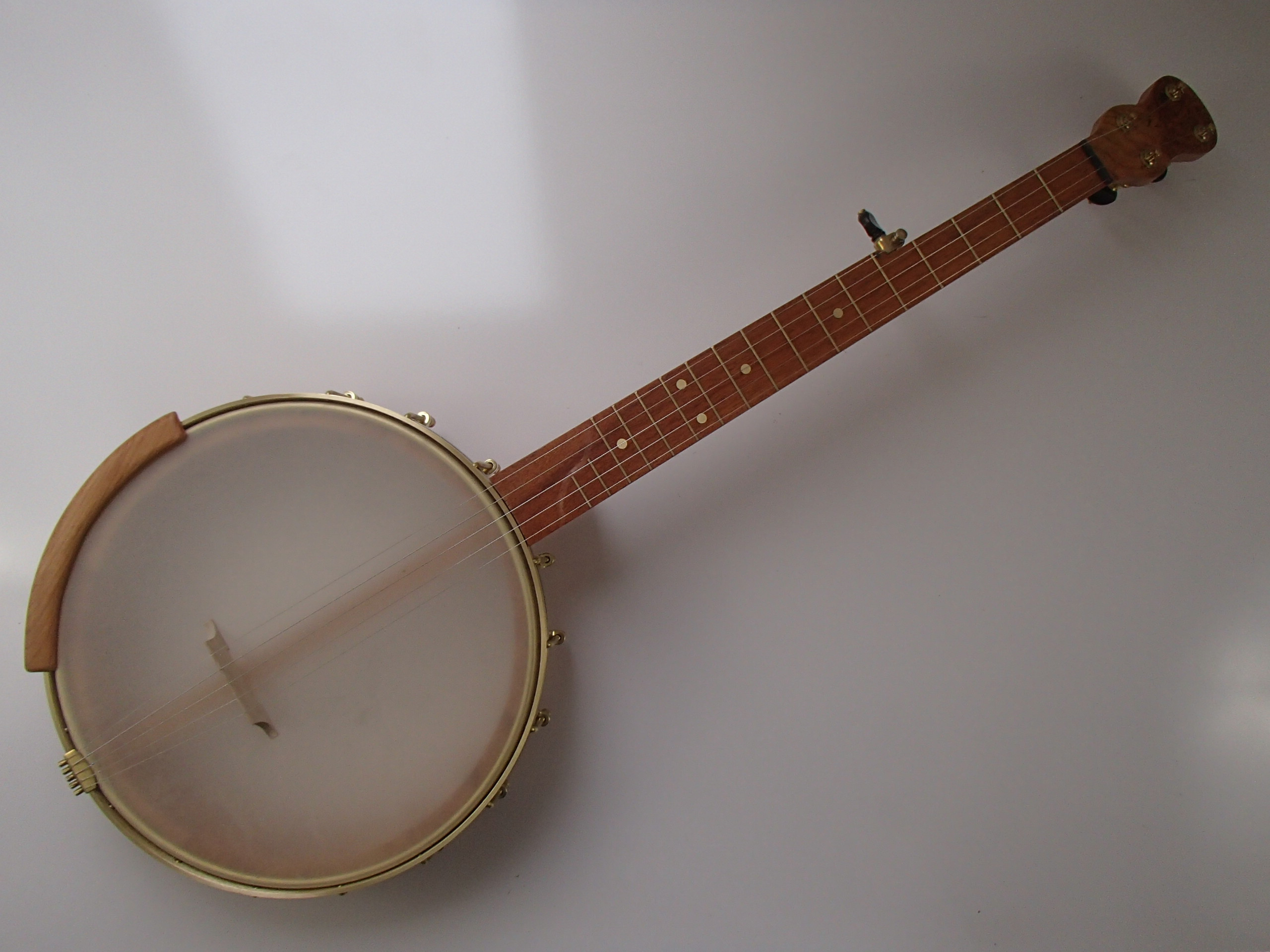 This banjo is made from cherry with a cherry burl peghead overlay and a jatoba fretboard.  I will sell the banjo without the Romero-style armrest for $30 less if you don’t want it.  This banjo has a Renaissance head on a 12″ block rim, 5/8″ thick, with a wood tone ring profile.  The scale length is 25-1/2″ and the nut is 1-5/16″″ wide.  The neck has a two way truss rod accessed from the heel, brass dots, EVO fret wire, Gotoh tuners and Corian nuts.  I made the Van Eps style tension hoop and the dowel stick yoke, the tailpiece and head came from Smakula Fretted Instruments and the rest of the hardware came from Balsam Banjo Works.   The finish is Tru Oil.  There is a brass plate on the dowel stick with the banjo number and such on it.  The banjo is currently set up with a tall 5th string nut to raise the 5th to the level of the other strings, but I can shorten the nut so the string rests on the 5th fret if desired.  I can also add 5th string spikes for $5 each.  If you would prefer a Fiberskyn head I can install one at no extra cost.   If you want a case with this banjo I can ship it in a Superior bump case, model CD-1536, for $150.  To see a video demonstration of this banjo please follow the link below:
