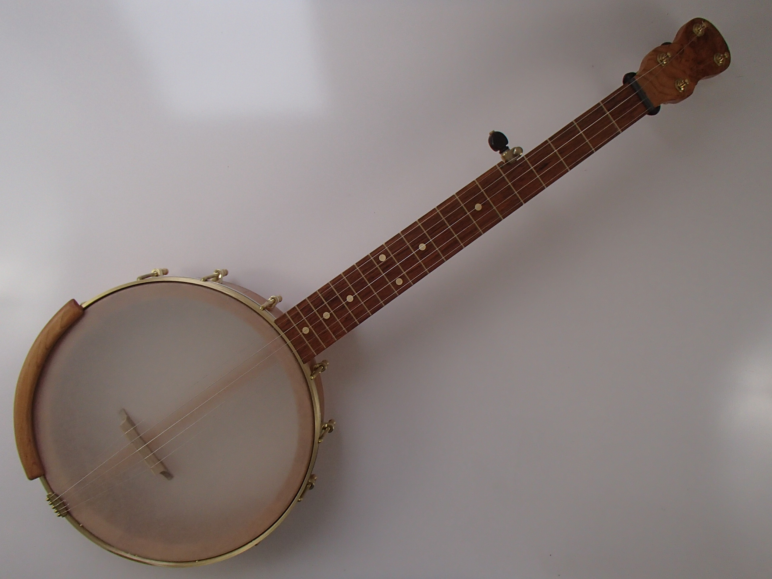 This banjo has a cherry rim, neck and Romero-style armrest, with a cherry burl peghead overlay and jatoba fretboard. I will sell the banjo without the armrest for $30 less. This banjo has a Renaissance head on an 11″ block rim, 5/8″ thick, with a wood tone ring profile. The scale length is 23″ and the nut is 1-3/8″ wide. The neck has a two way truss rod accessed from the heel, brass dots, EVO fret wire, Gotoh tuners and Corian nuts. I made the brass Van Eps style tension hoop and the dowel stick yoke, the tailpiece and head came from Smakula Fretted Instruments and the rest of the hardware came from Balsam Banjo Works. The finish is Tru Oil. There is a brass plate on the dowel stick with the banjo number and such on it. The banjo is currently set up with a tall 5th string nut to raise the 5th to the level of the other strings, but I can shorten the nut so the string rests on the 5th fret if desired. I can also add 5th string spikes for $5 each. If you would prefer a Fiberskyn head I can install one at no extra cost. To see a video demonstration of this banjo please follow the link below: