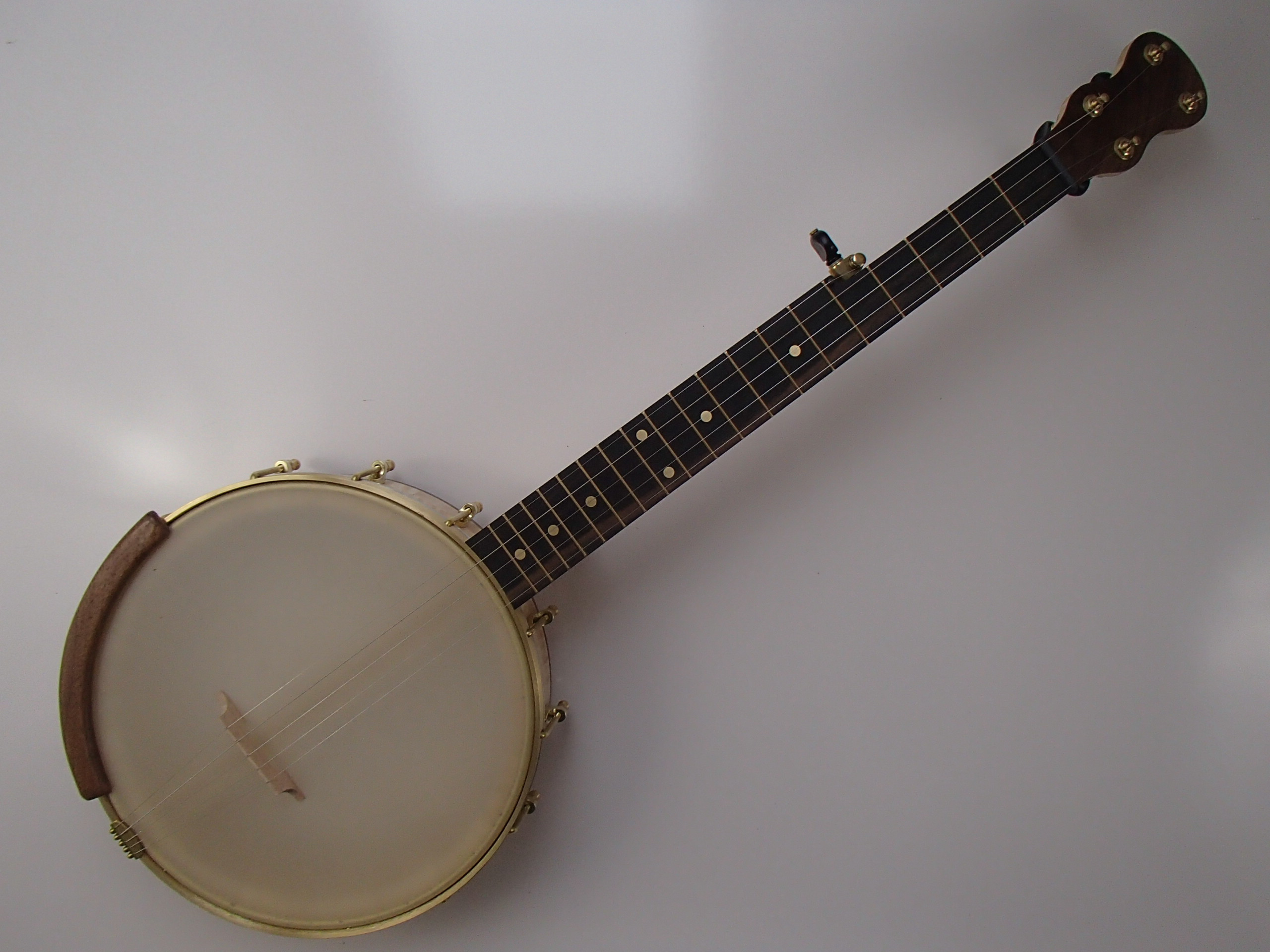 This banjo has a curly maple rim and neck with walnut trim and Romero-style armrest and a streaky ebony fretboard. I will sell the banjo without the armrest for $35 less. This banjo has a Renaissance head on an 11″ block rim, 5/8″ thick, with a wood tone ring profile. The scale length is 23″ and the nut is 1-3/8″ wide. The neck has a two way truss rod accessed from the heel, brass dots, EVO fret wire, Gotoh tuners and Corian nuts. I made the brass Van Eps style tension hoop and the dowel stick yoke, the head and tuners came from Smakula Fretted Instruments and the rest of the hardware came from Balsam Banjo Works. The finish is Tru Oil. There is a brass plate on the dowel stick with the banjo number and such on it. The banjo is currently set up with a tall 5th string nut to raise the 5th to the level of the other strings, but I can shorten the nut so the string rests on the 5th fret if desired. I can also add 5th string spikes for $5 each. If you would prefer a Fiberskyn head I can install one at no extra cost. To see a video demonstration of this banjo please follow the link below: