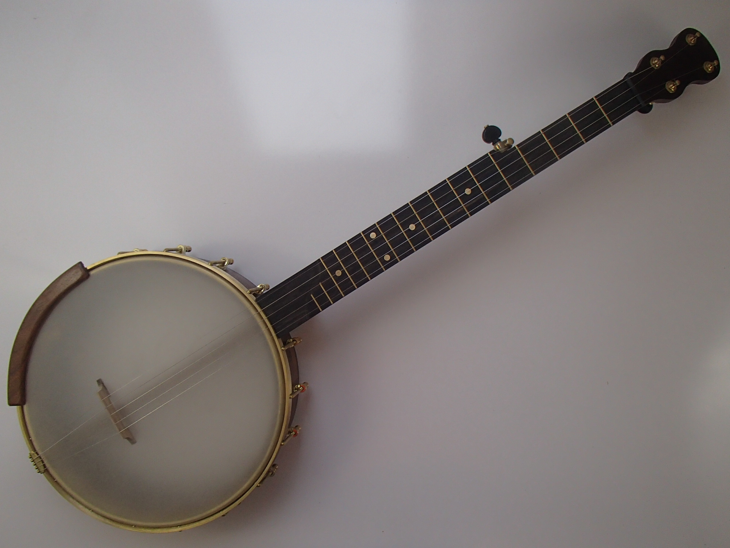This banjo has a walnut rim, neck and Romero-style armrest, with an ebony fretboard and a curly walnut peghead overlay. I will sell the banjo without the armrest for $35 less if it isn’t wanted. This banjo has a Renaissance head on a 12″ block rim with a brass Whyte Laydie/Electric type tone ring and a walnut rim cap. The scale length is 25-1/2″ and the nut is 1-3/8″ wide. The neck has a two way truss rod accessed from the heel, brass dots, EVO fret wire, Gotoh tuners and Corian nuts. I made the Van Eps style tension hoop, the tone ring, and the dowel stick yoke. The tailpiece, tuners and head came from Smakula Fretted Instruments and the rest of the hardware came from Balsam Banjo Works. The finish is Tru Oil. There is a brass plate on the dowel stick with the banjo number and such on it. The banjo is currently set up with a tall 5th string nut to raise the 5th to the level of the other strings, but I can shorten the nut so the string rests on the 5th fret if desired. I can also add 5th string spikes for $5 each. If you would prefer a Fiberskyn head I can install one at no extra cost. If you want a case with this banjo I can ship it in a Superior bump case, model CD-1536, for $150. To see a video demonstration of this banjo and #217 which is similar but has a wood tone ring profile please follow the link below.