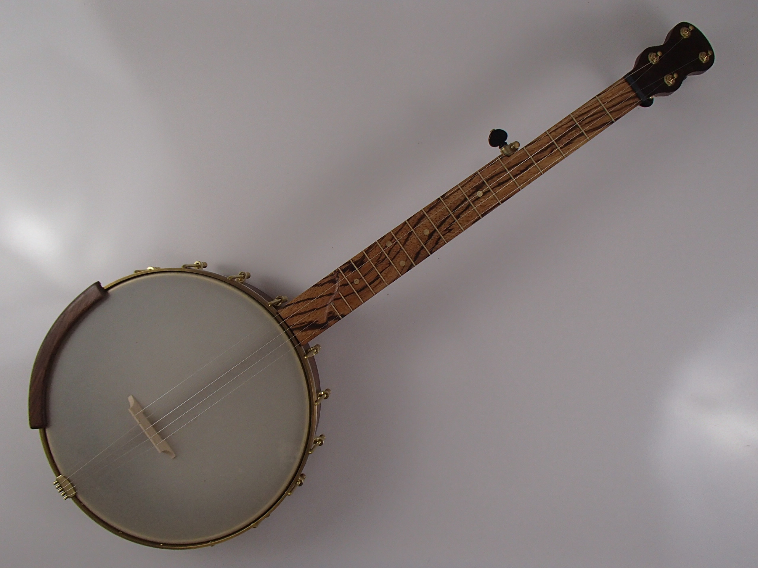 This banjo has a walnut rim, neck and Romero-style armrest, with a zebrawood fretboard and a curly walnut peghead overlay. I will sell the banjo without the armrest for $35 less if it isn’t wanted. This banjo has a Renaissance head on a 12″ block rim with a brass Whyte Laydie/Electric type tone ring and a walnut rim cap. The scale length is 25-1/2″ and the nut is 1-3/8″ wide. The neck has a two way truss rod accessed from the heel, brass dots, EVO fret wire, Gotoh tuners and Corian nuts. I made the Van Eps style tension hoop, the tone ring, and the dowel stick yoke. The tailpiece, tuners and head came from Smakula Fretted Instruments and the rest of the hardware came from Balsam Banjo Works. The finish is Tru Oil. There is a brass plate on the dowel stick with the banjo number and such on it. The banjo is currently set up with a tall 5th string nut to raise the 5th to the level of the other strings, but I can shorten the nut so the string rests on the 5th fret if desired. I can also add 5th string spikes for $5 each. If you would prefer a Fiberskyn head I can install one at no extra cost. If you want a case with this banjo I can ship it in a Superior bump case, model CD-1536, for $150. To see a video demonstration of this banjo please follow the link below.