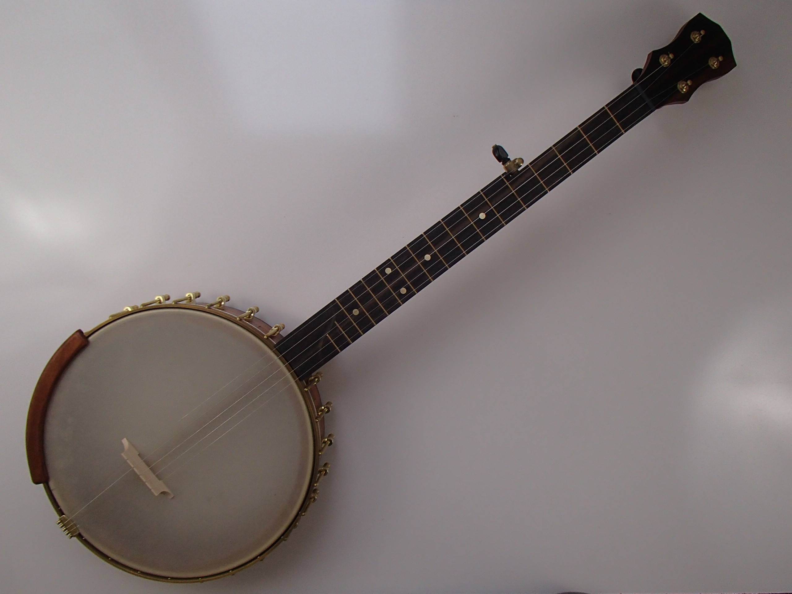 This banjo is slightly different then my usual stock banjos, with a longer scale length, more brackets, and a different peghead shape. The rim, neck and Romero-style armrest are African mahogany, and the fretboard, neck stripe, rim cap and peghead overlay are ebony. I will sell the banjo without the armrest for $35 less if it isn’t wanted. This banjo has a Renaissance head on a 12″ block rim with a 1/4″ round brass brass tone hoop. The scale length is 26-3/16″ and the nut is 1-3/8″ wide. The neck has a two way truss rod accessed from the heel, brass dots, EVO fret wire, Gotoh tuners and Corian nut and pip. I made the Van Eps style tension hoop and the dowel stick yoke, the tailpiece, tuners and head came from Smakula Fretted Instruments and the rest of the hardware came from Balsam Banjo Works. The finish is Tru Oil. There is a brass plate on the dowel stick with the banjo number and such on it. The banjo is currently set up with a tall 5th string nut to raise the 5th to the level of the other strings, but I can shorten the nut so the string rests on the 5th fret if desired. I can also add 5th string spikes for $5 each. If you would prefer a Fiberskyn head I can install one at no extra cost. If you want a case with this banjo I can ship it in a Superior bump case, model CD-1536, for $150. To see a video demonstration of this banjo please follow the link below.