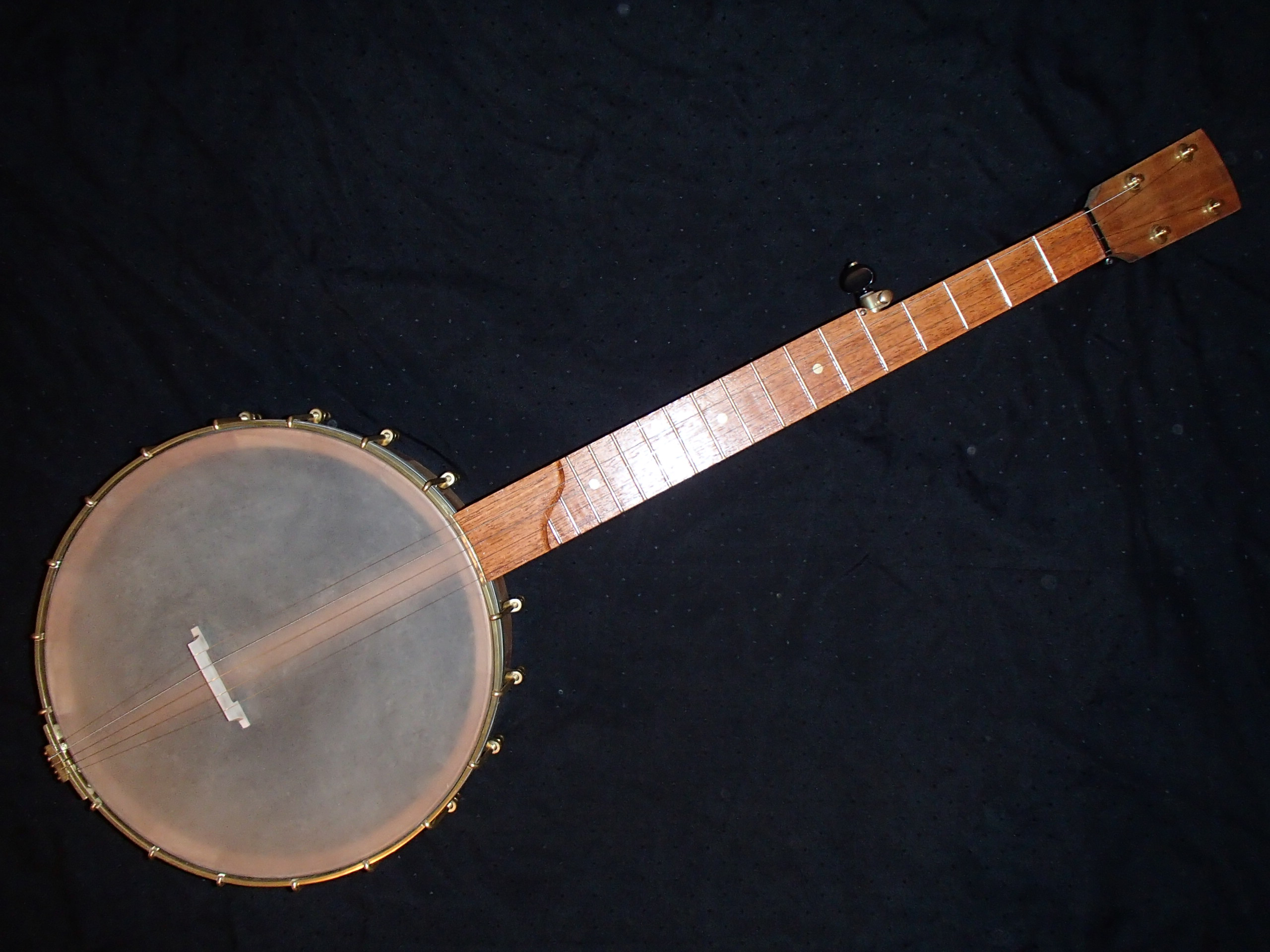This is the 25th banjo I have built. It was started in December 2015 and finished in January 2016. The wood is cherry with a jatoba fretboard and maple bridge. It has Gotoh raw brass tuners, a brass tension hoop that I made myself and the rest of the brass hardware came from Balsam Banjo Works. The fretwire is EVO Gold. The position marker dots in the fretboard are brass. Renaissance head on a 12″ block rim with a wood tone ring profile turned into the top. The neck has a two way truss rod accessed through the heel. The nut is made from Corian. The banjo has a Tru Oil finish. The scale length is 25-1/2″ and the nut width is 1-3/8″.