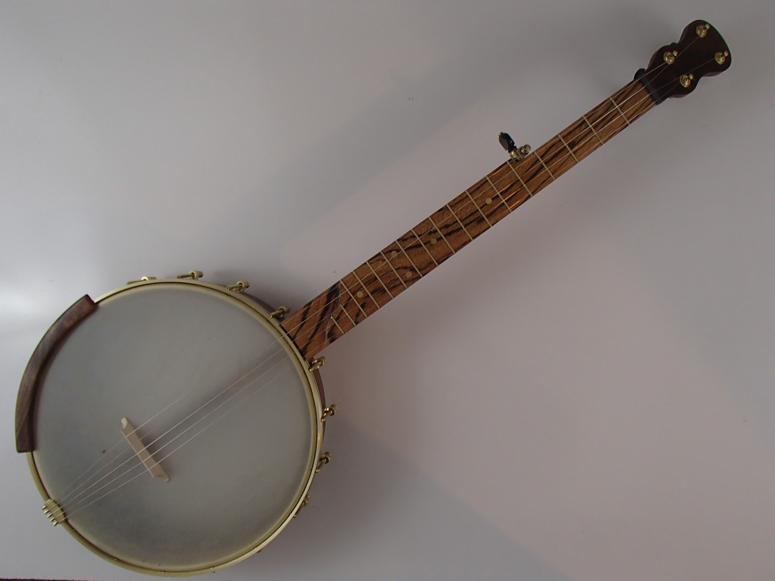 This banjo has a walnut rim, neck, and Romero-style armrest with a zebrawood fretboard. I will sell the banjo without the armrest for $35 less if it isn’t wanted. This banjo has a Renaissance head on a 12″ block rim with a brass Whyte Laydie/Electric type tone ring and a walnut rim cap. The scale length is 25-1/2″ and the nut is 1-3/8″ wide. The neck has a two way truss rod accessed from the heel, brass dots, EVO fret wire, Gotoh tuners and Corian nuts. I made the Van Eps style tension hoop, the tone ring, and the dowel stick yoke. The tailpiece, tuners, and head came from Smakula Fretted Instruments, and the rest of the hardware came from Balsam Banjo Works. The finish is Tru Oil. There is a brass plate on the dowel stick with the banjo number and such on it. The banjo is currently set up with a tall 5th string nut to raise the 5th to the level of the other strings, but I can shorten the nut so the string rests on the 5th fret if desired. I can also add 5th string spikes for $5 each. If you would prefer a Fiberskyn head I can install one at no extra cost. If you want a case with this banjo I can ship it in a Superior bump case, model CD-1536, for $175. To see a video demonstration of this banjo please follow the link below: