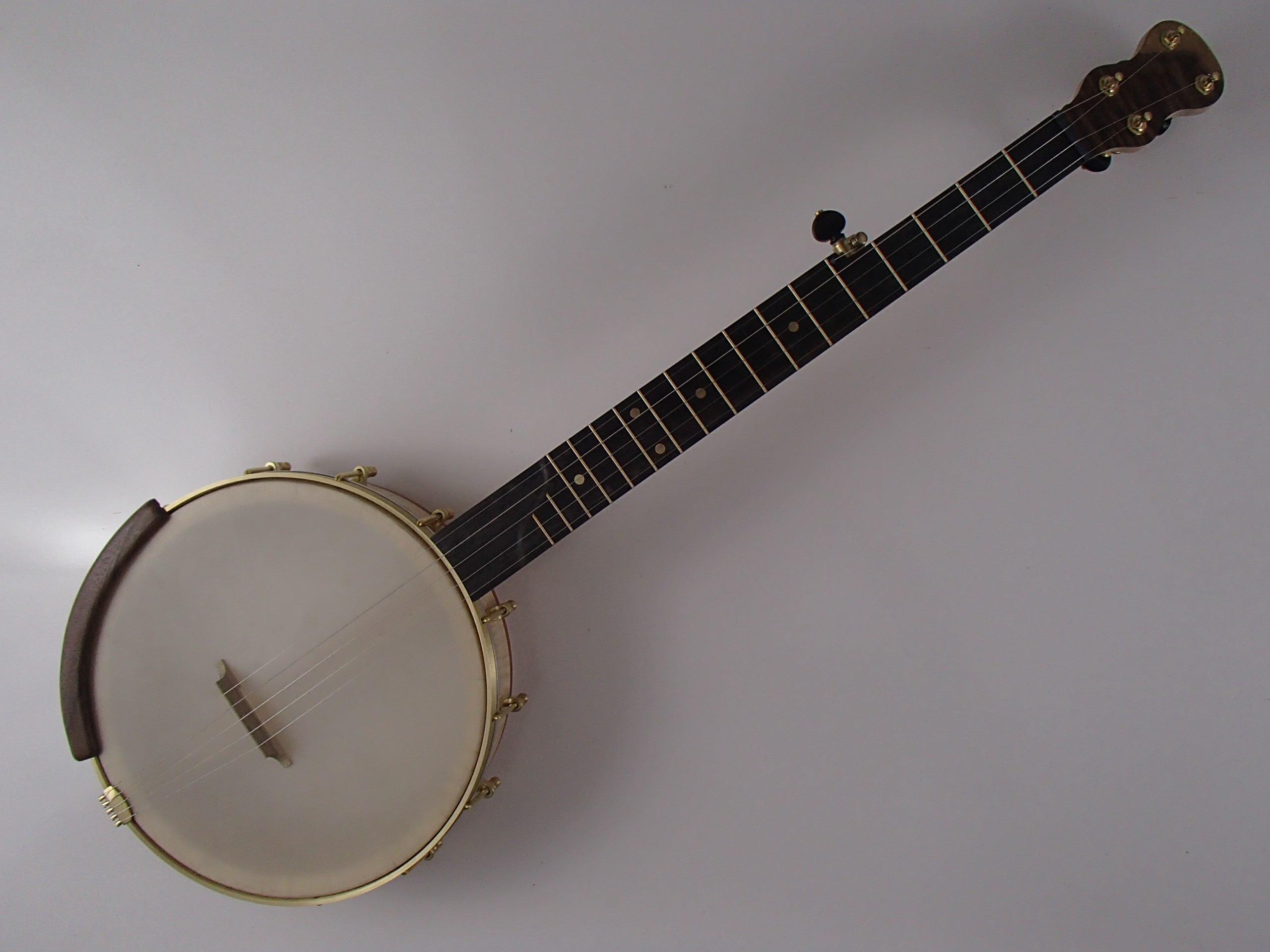 This banjo has a curly maple rim, neck and Romero-style armrest, with an ebony fretboard, curly walnut peghead overlay, and cherry neck stripe, heel cap and rim cap. I will sell the banjo without the armrest for $35 less if it isn’t wanted. This banjo has a Renaissance head on an 11″ block rim with a wood tone ring profile turned into the top. The scale length is 25-1/2″ and the nut is 1-3/8″ wide. The neck has a two way truss rod accessed from the heel, brass dots, EVO fret wire, Gotoh tuners and Corian nuts. I made the Van Eps style tension hoop, the tone hoop, and the dowel stick yoke, the tailpiece, tuners and head came from Smakula Fretted Instruments, and the rest of the hardware came from Balsam Banjo Works. The finish is Tru Oil. There is a brass plate on the dowel stick with the banjo number and such on it. The banjo is currently set up with a tall 5th string nut to raise the 5th to the level of the other strings, but I can shorten the nut so the string rests on the 5th fret if desired. I can also add 5th string spikes for $5 each. If you would prefer a Fiberskyn head I can install one at no extra cost. If you want a case with this banjo I can ship it in a Superior bump case, model CD-1535, for $175. To see a video demonstration of this banjo please follow the link below: