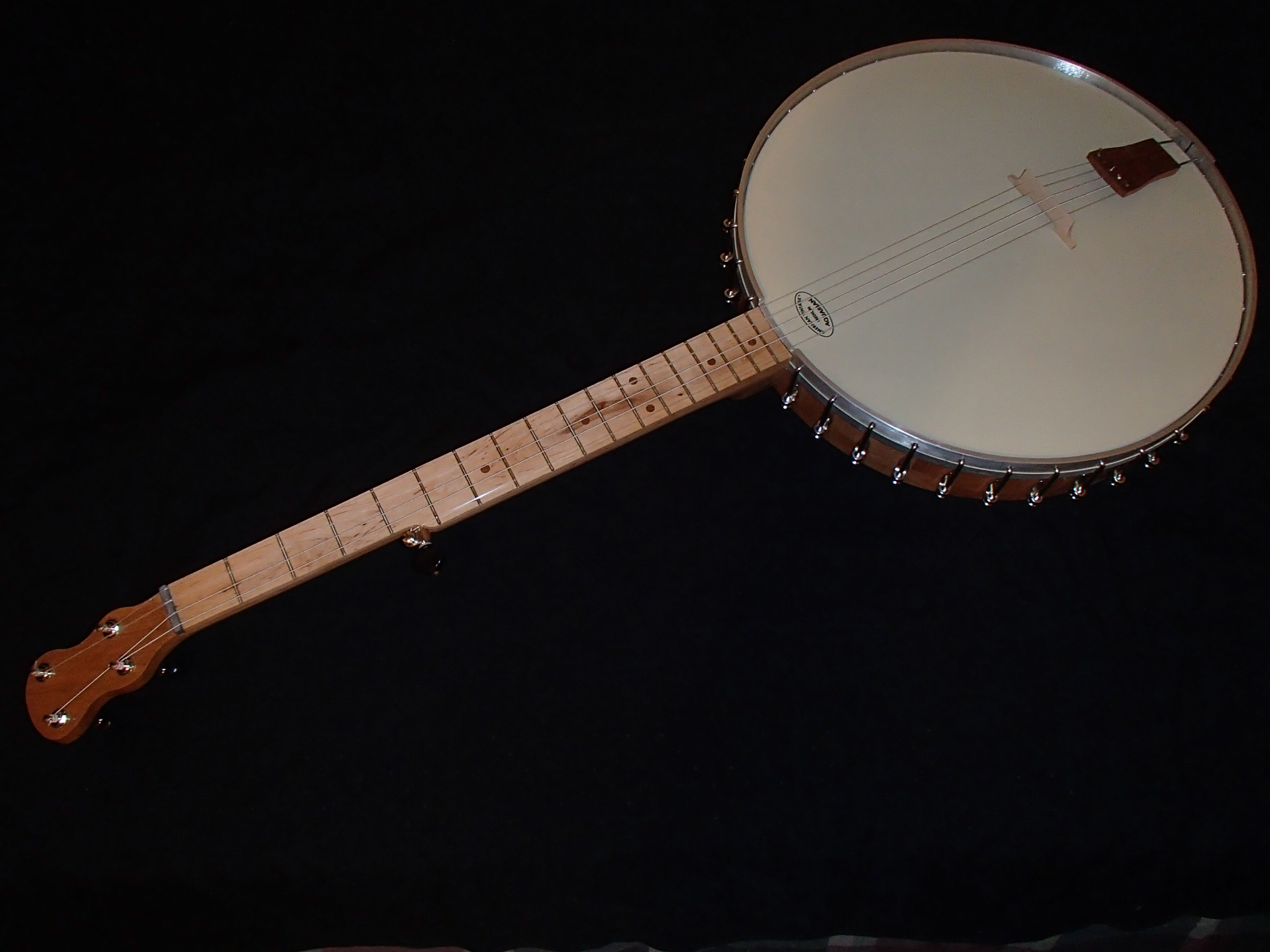 I started building this in December 2015 and finished in February 2016. The pot is 16″ in diameter and made from cherry wood. It has a drum head mounted on a wood tone ring. The tension hoop is made from 6061 aluminum. There are 36 brackets and the hooks, nuts and shoes are nickel plated. The tailpiece is homemade from jatoba and wire. The pictures show two different necks, both made from cherry with two way truss rods, Gotoh nickel plated tuners and guitar size fret wire. One is a 25″ scale neck with a jatoba fretboard, the other is 29″ scale with a hophornbeam fretboard. I set up the long neck with nylon guitar strings and the short neck with wound steel guitar strings. The tuning is gDGBD for both, one octave below standard banjo tuning. I have made demonstration videos with each neck that can be seen at the links below. The price of $750 includes your choice of necks and accompanying strings and bridge. If you want both necks the price is $950. Just send me an email if you’d like both necks and I can send a paypal invoice for the second neck. There is only one set of tuners but everything else is duplicated. The banjo is not as heavy as it looks. With the short neck it weighs 6 pounds 9 ounces and the with the long neck it weighs 6 pounds 12 ounces. It is a bit large and awkward to hold, but it’s no wider in the body than a jumbo guitar, so it is manageable. The tension hoop protrudes about 5/16″ above the surface of the head, which is unusual for a banjo but that is how it worked out with the drum head. It looks different but it doesn’t affect how it plays. I have more pictures of both necks.