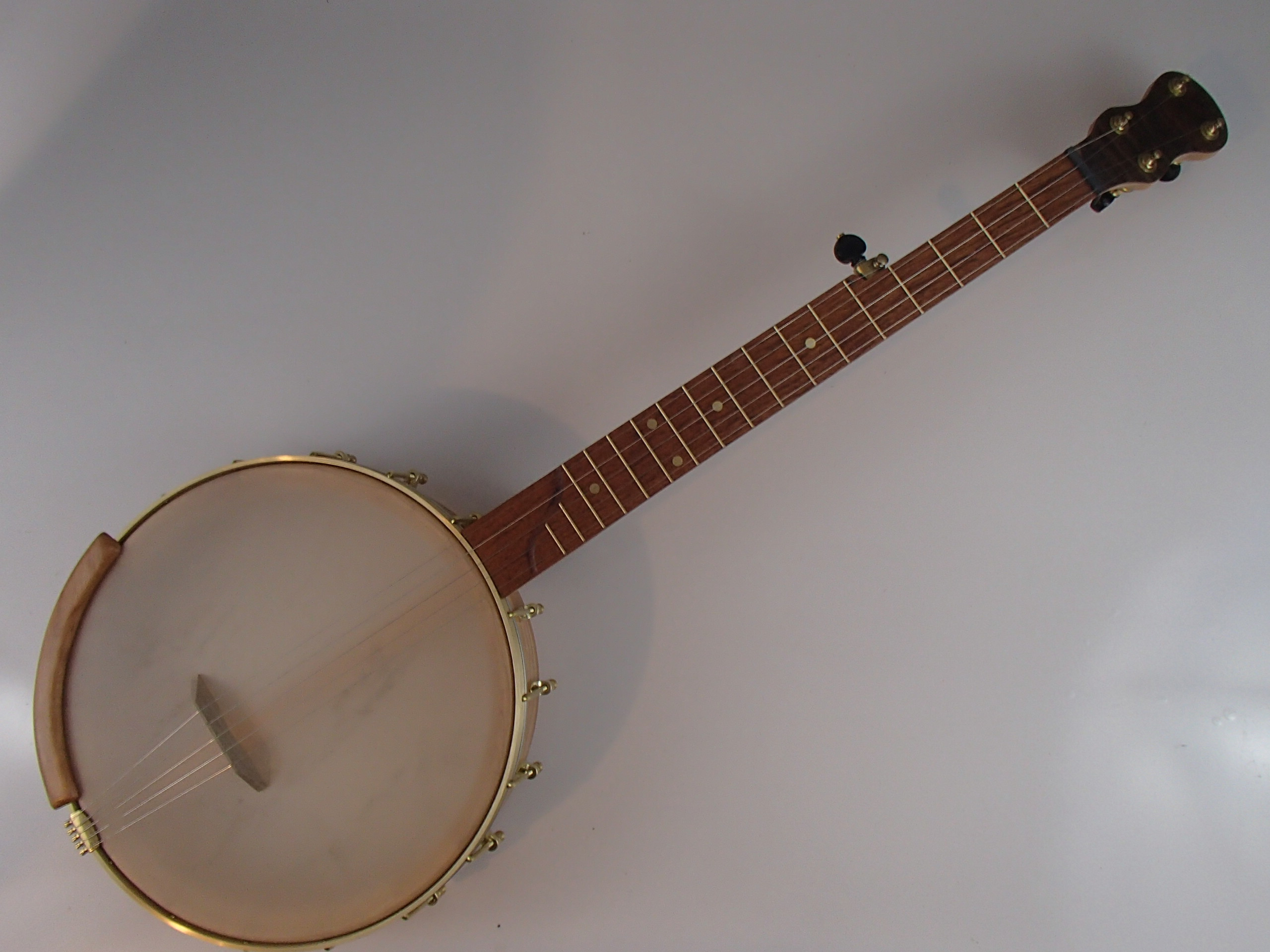 This banjo has a cherry rim, neck, and Romero-style armrest, a jatoba fretboard, a walnut peghead overlay and heel cap, and raw brass hardware. The wood has a Tru Oil finish. I will sell the banjo without the armrest for $30 less. The 12″ block rim has a wood tone ring profile turned into the top. The head is a Renaissance, and I can exchange it for a Fiberskyn at no charge. I made the Van Eps style tension hoop and the dowel stick yoke, the head, tailpiece and Gotoh tuners came from Smakula Fretted Instruments and the rest of the hardware came from Balsam Banjo Works. The brass plate on the dowel stick has my name, the banjo number, and the town and year of production. There is a two way truss rod in the neck, accessed from the heel. The scale length is 25-1/2″, the nut is 1-3/8″ wide and made from Corian, and the frets are EVO. The 5th string nut is tall, to keep all the strings in the same plane, but I can shorten it so the 5th string rests on the 5th fret if you prefer. I can add 5th string spikes for $5 each. If you want a case I can send the banjo in a Superior CD-1536 for $175. It is also fine to ship the banjo without a case if you don’t want one. To see a short video demonstration of this banjo please follow the link below: