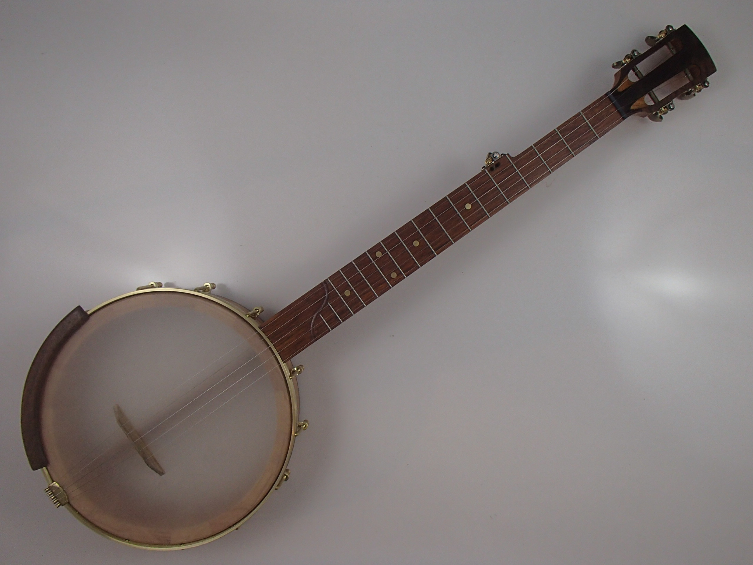 This banjo is made from cherry with walnut trim and a jatoba fretboard.  I will sell the banjo without the Romero-style armrest for $35 less.  The rim is 11″ with a wood tone ring profile, the scale length is 25.5″ and the nut width is 1-3/8″. It has brass right angle tuners and a two way truss rod in the neck, accessed at the heel.  The dots are brass, and the nut is Corian.  The Renaissance head and No-Knot tailpiece came from Smakula Fretted Instruments, I made the dowel stick yoke and Van Eps style tension hoop myself and the rest of the hardware came from Balsam Banjo Works.  There is a brass plate on the dowel stick with my name, the town and year of production and the banjo number on it.  I can install a Fiberskyn head on this banjo at no cost, and I can put in fretboard spikes for $5 each.  If you’d like a case I can ship this banjo in a Superior CD-1535 ‘bump’ case for $175. To see a short video demo please follow the link below: