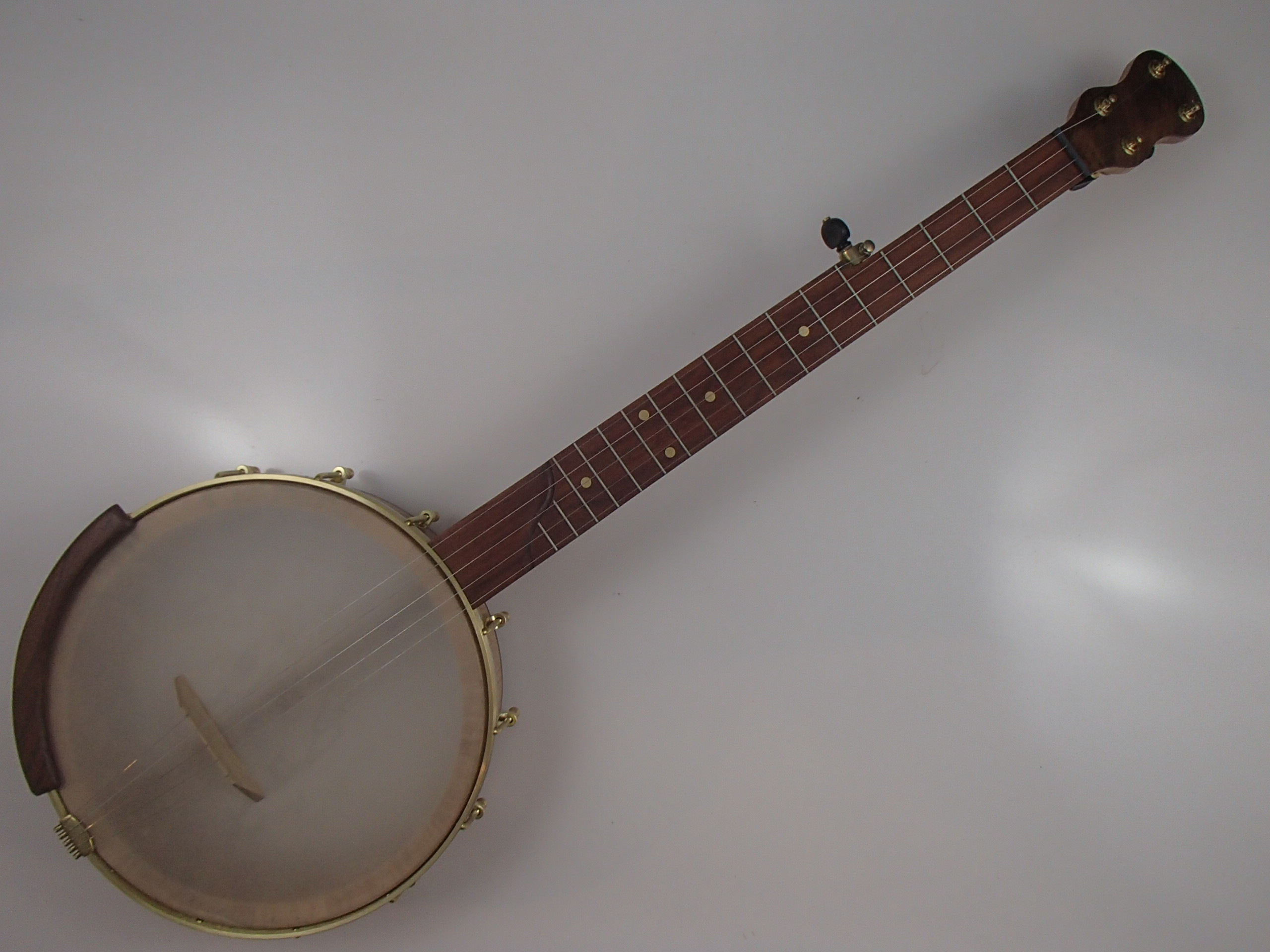 This banjo is made from curly maple with walnut trim and a granadillo fretboard.  I will sell the banjo without the Romero-style armrest for $35 less.  The rim is 11″ with wood tone ring profile, the scale length is 25.5″ and the nut width is 1-3/8″. It has Gotoh tuners and a two way truss rod in the neck, accessed at the heel.  The dots are brass, and the nut and pip are Corian.  The Renaissance head and No-Knot tailpiece came from Smakula Fretted Instruments, I made the dowel stick yoke and Van Eps style tension hoop myself and the rest of the hardware came from Balsam Banjo Works.  There is a brass plate on the dowel stick with my name, the town and year of production and the banjo number on it.  I can install a Fiberskyn head on this banjo at no cost, and I can put in fretboard spikes for $5 each.  If you’d like a case I can ship this banjo in a Superior CD-1535 ‘bump’ case for $175. To see a short video demo of this banjo and #292 please follow the link below: