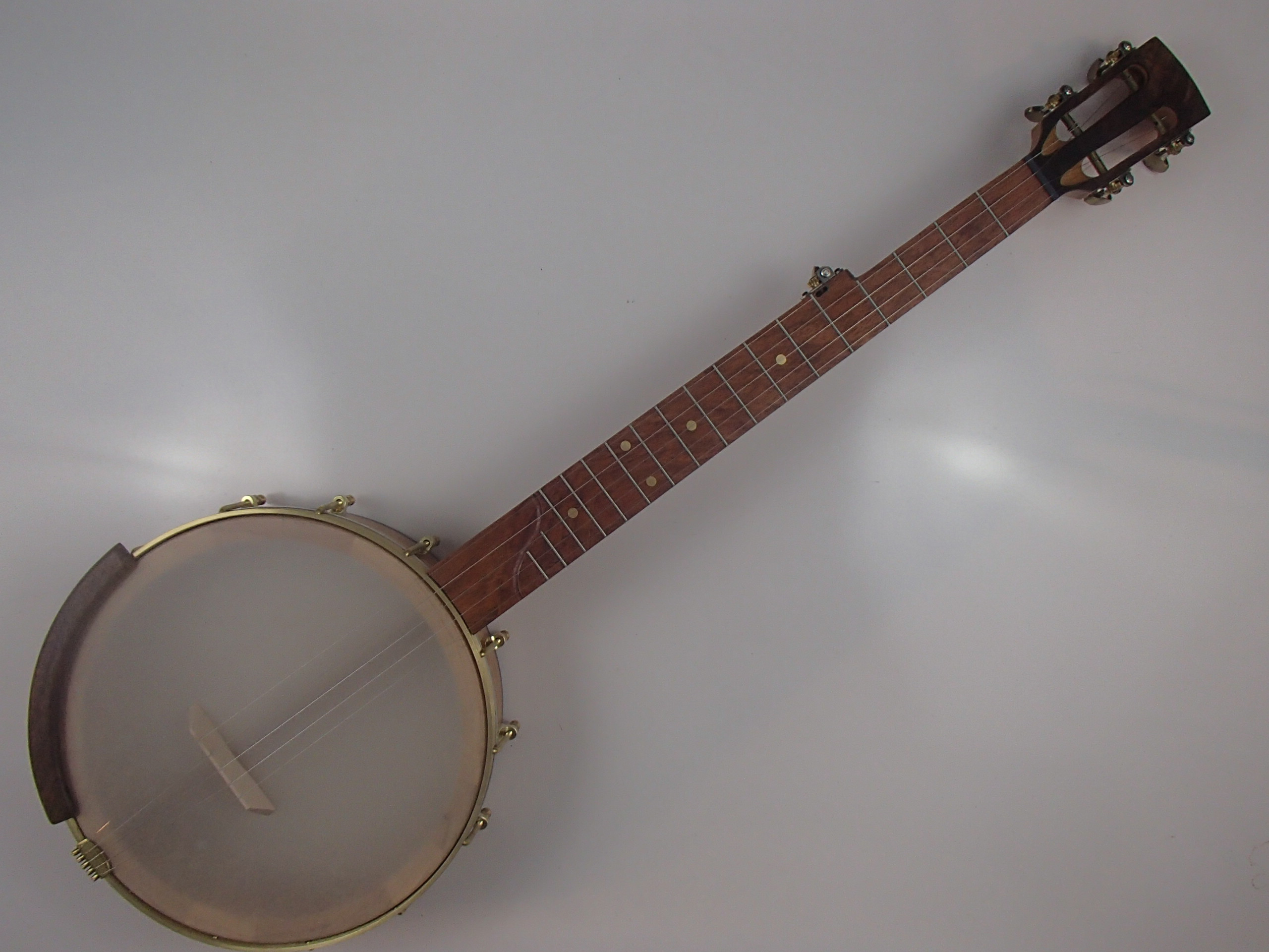This banjo is made from cherry with walnut trim and a jatoba fretboard. I will sell the banjo without the Romero-style armrest for $35 less. The rim is 11″ with a wood tone ring profile, the scale length is 25.5″ and the nut width is 1-3/8″. It has brass right angle tuners and a two way truss rod in the neck, accessed at the heel. The dots are brass, and the nut is Corian. The Renaissance head and No-Knot tailpiece came from Smakula Fretted Instruments, I made the dowel stick yoke and Van Eps style tension hoop myself and the rest of the hardware came from Balsam Banjo Works. There is a brass plate on the dowel stick with my name, the town and year of production and the banjo number on it. I can install a Fiberskyn head on this banjo at no cost, and I can put in fretboard spikes for $5 each. If you’d like a case I can ship this banjo in a Superior CD-1535 ‘bump’ case for $175. To see a short video demo please follow the link below: