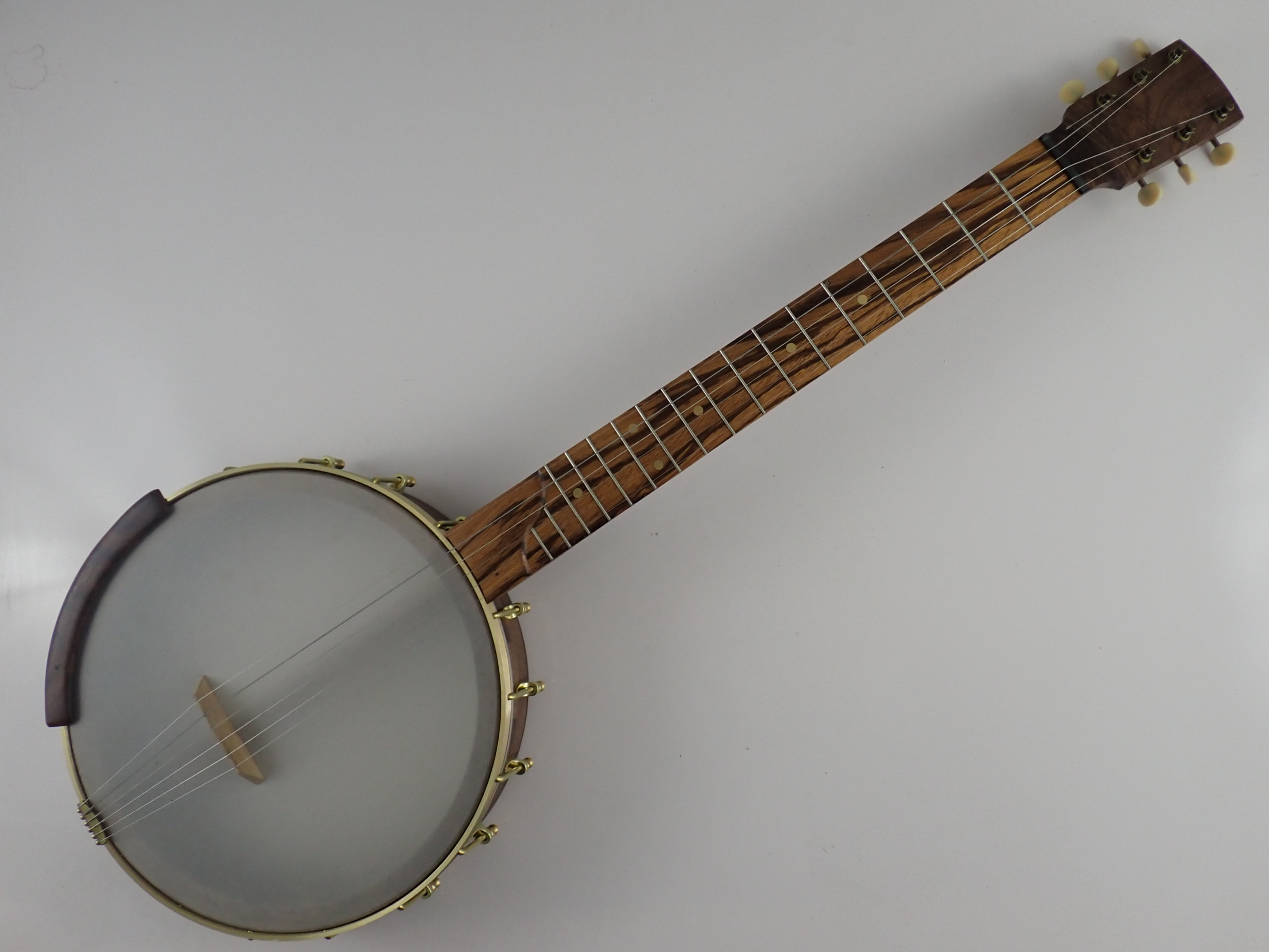 –This banjo was $1185, now reduced to $1066.– This banjo design goes back to banjo #46 which I built 6 years ago. I haven’t had one in stock for a while, though. The basic idea is that the banjo can be set up as a 5+1 or “lojo” which is tuned like a standard 5 string but with an extra low G added below the low D in open G tuning. The high G string runs through a stainless steel tunnel from the 5th fret and emerges under the nut, through the peghead overlay. This string can be removed and replaced with a .046″ string which runs over the nut in the usual way to tune EADGBE like a guitar. I wanted to make one originally to see if it would work, and #46 sat around for over a year before Steve Jones came to see it and bought it. He is a very skilled banjo player and has graciously offered to let me link to his videos he has made with #46 so that you can hear what this style of banjo can sound like in the hands of a real musician.