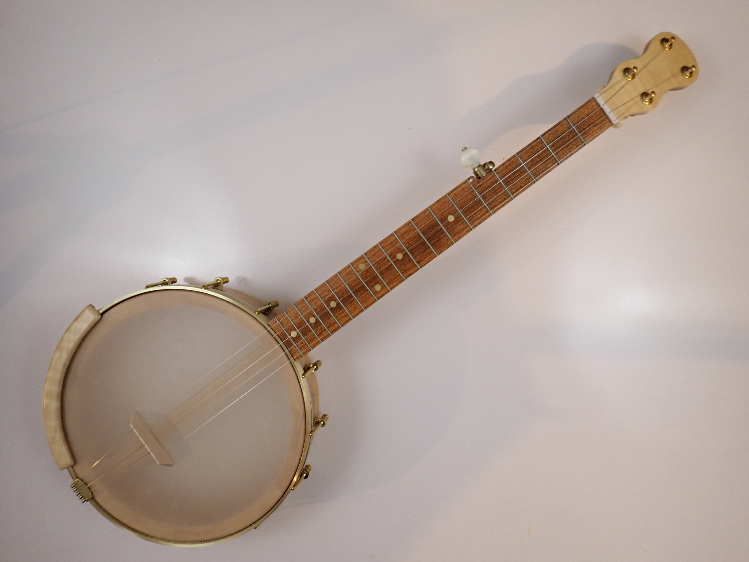 This banjo has a cherry rim, neck and Romero-style armrest with curly maple trim and a jatoba fretboard. I will sell the banjo without the armrest for $30 less.  This banjo has a Renaissance head on an 11″ block rim, 5/8″ thick, with a wood tone ring profile.  The scale length is 23″ and the nut is 1-3/8″ wide.  The neck has a two way truss rod accessed from the heel, brass dots, Gotoh tuners and Corian nut and pip.  I made the brass Van Eps style tension hoop and the dowel stick yoke, the head, tailpiece and tuners came from Smakula Fretted Instruments and the rest of the hardware came from Balsam Banjo Works.   The finish is Tru Oil.  There is a brass plate on the dowel stick with the banjo number and such on it.  The banjo is currently set up with a tall 5th string nut to raise the 5th to the level of the other strings, but I can shorten the nut so the string rests on the 5th fret if desired.  I can also add 5th string spikes for $5 each.  If you would prefer a Fiberskyn head I can install one at no extra cost.  To see a video demonstration of this banjo please follow the link below: