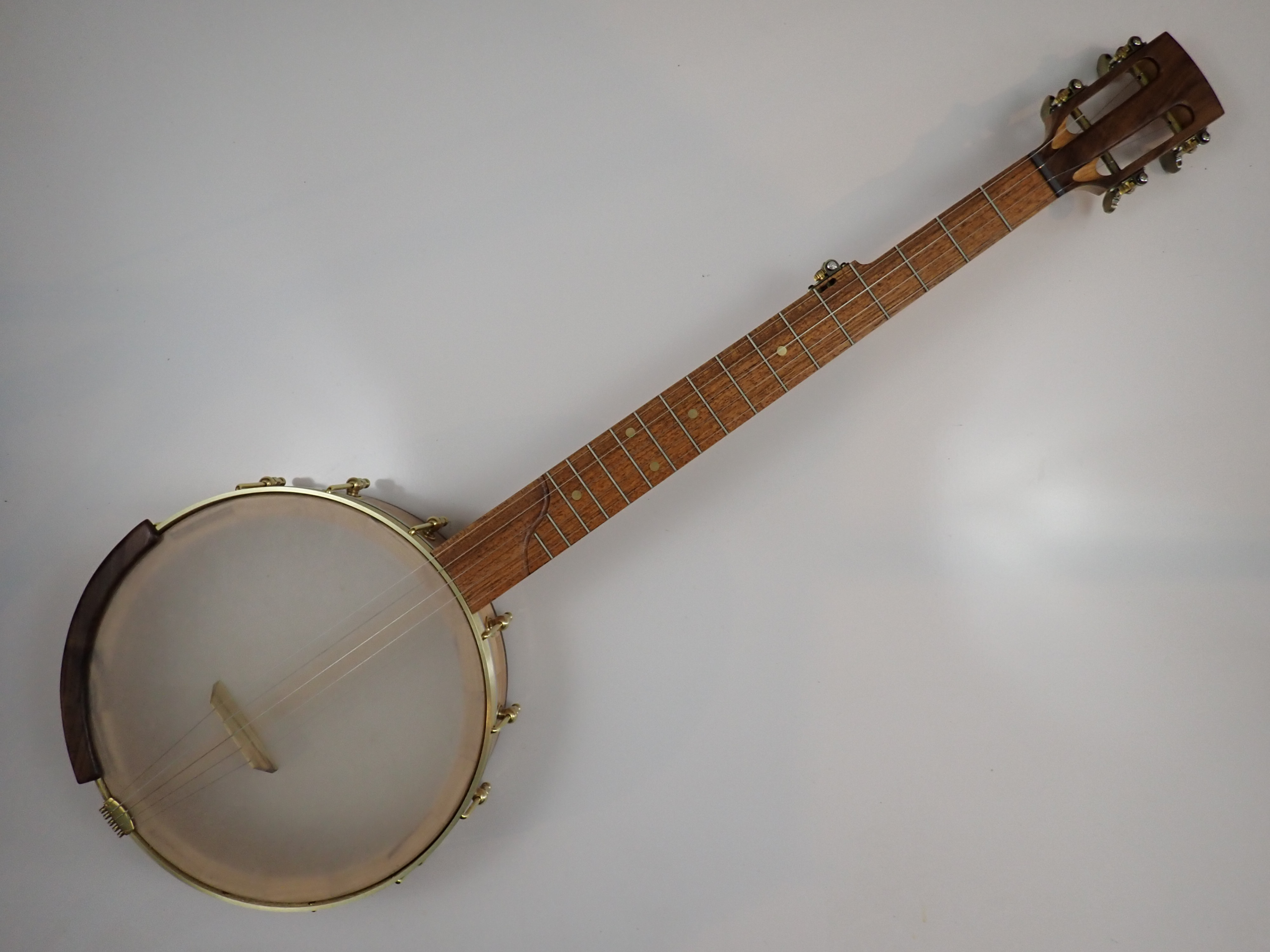 This banjo is made from cherry with walnut trim and a jatoba fretboard. I will sell the banjo without the Romero-style armrest for $35 less. The rim is 11″ with a wood tone ring profile, the scale length is 25.5″ and the nut width is 1-3/8″. The banjo has brass right angle tuners and a two way truss rod in the neck, accessed at the heel. The dots are brass, and the nut is Corian. The Renaissance head and No-Knot tailpiece came from Smakula Fretted Instruments, I made the dowel stick yoke and Van Eps style tension hoop myself, the shoes, hooks, and nuts came from Ode Banjo Parts and the rest of the hardware came from Balsam Banjo Works. There is a brass plate on the dowel stick with my name, the town and year of production and the banjo number on it. I can install a Fiberskyn head on this banjo at no cost, and I can put in fretboard spikes for $5 each. If you’d like a case I can ship this banjo in a Superior CD-1535 ‘bump’ case for $175. To see a short video demo please follow the link below: