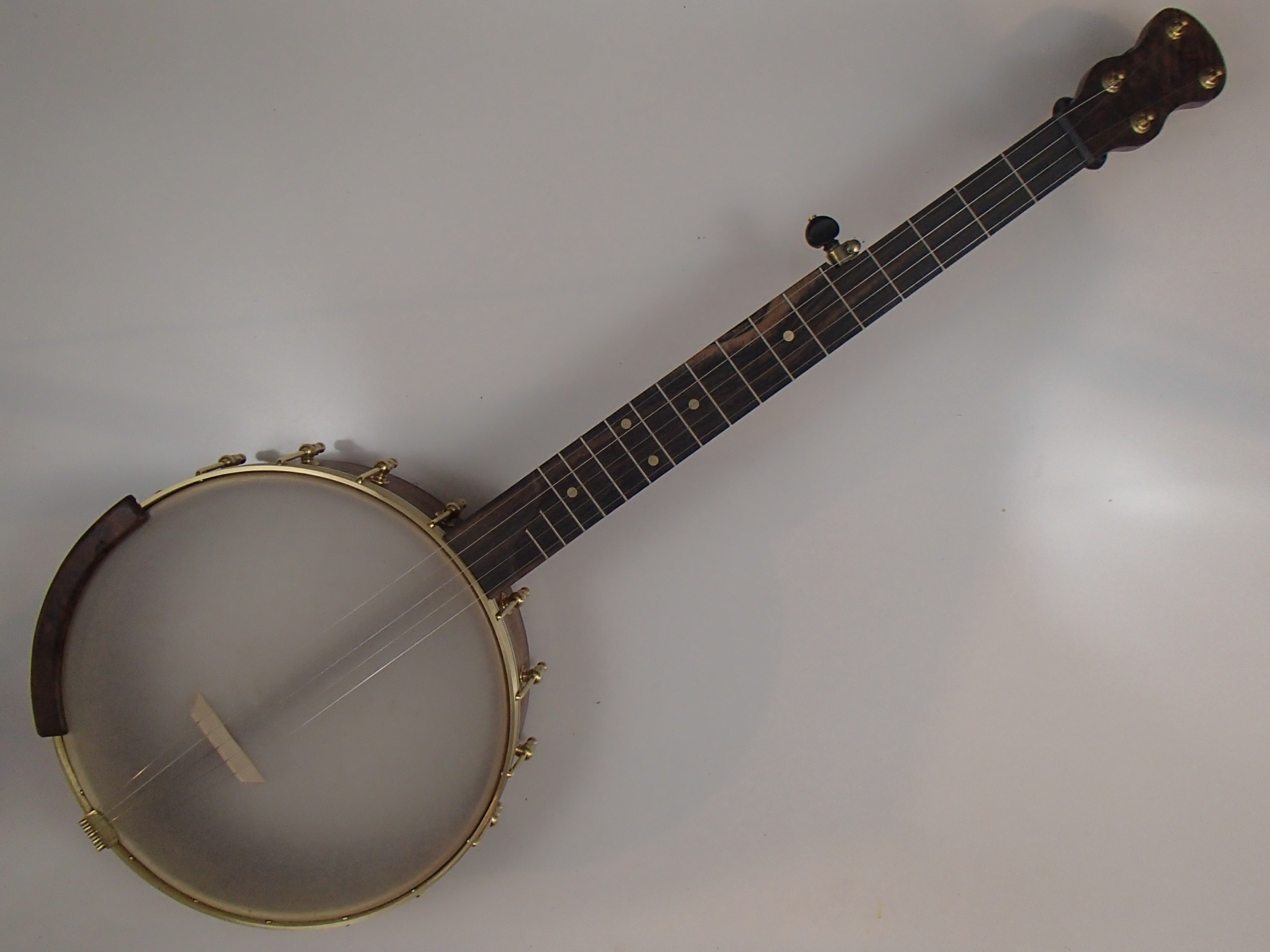 This banjo has a walnut rim, neck and Romero-style armrest, an ebony fretboard, and raw brass hardware. The wood has a Tru Oil finish. I will sell the banjo without the armrest for $35 less. The 12″ block rim has a brass Whyte Laydie/Electric type tone ring. The head is a Renaissance, and I can exchange it for a Fiberskyn at no charge. I made the Van Eps style tension hoop, the tone ring, and the dowel stick yoke. The head, tailpiece, strings, and Gotoh tuners came from Smakula Fretted Instruments and the hooks, nuts, shoes and endbolt came from Ode Banjos. The brass plate on the dowel stick has my name, the banjo number, and the town and year of production. There is a two way truss rod in the neck, accessed from the heel. The scale length is 25-1/2″, and the nut is 1-3/8″ wide and made from Corian. The 5th string nut is tall, to keep all the strings in the same plane, but I can shorten it so the 5th string rests on the 5th fret if you prefer. I can add 5th string spikes for $5 each. If you want a case I can send the banjo in a Superior CD-1536 for $175. It is also fine to ship the banjo without a case if you don’t want one. To see a short video demonstration of this banjo please follow the link below: