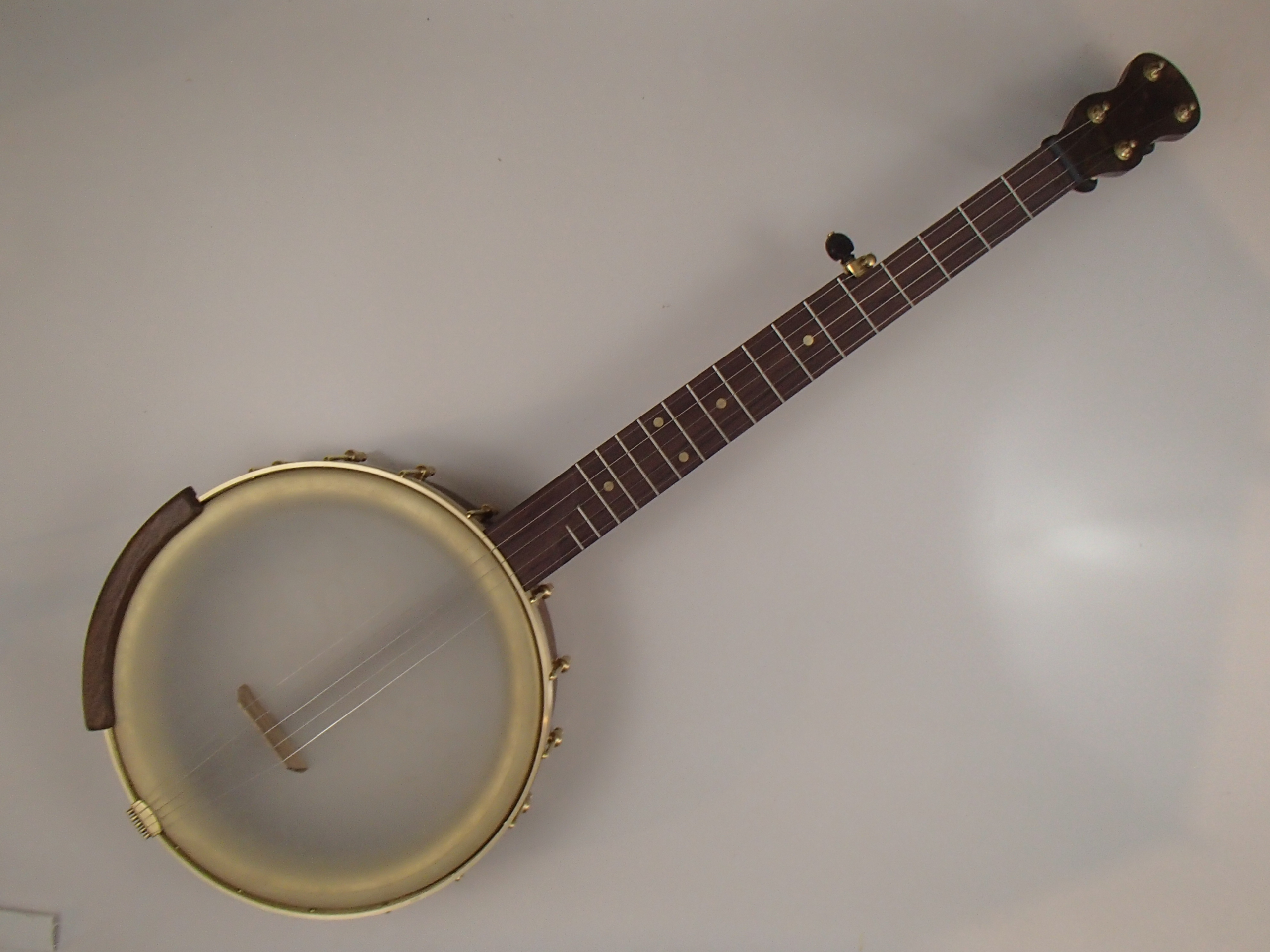 This banjo has a walnut rim, neck and Romero-style armrest, a rosewood fretboard, and raw brass hardware. The wood has a Tru Oil finish. I will sell the banjo without the armrest for $35 less. The 12″ rim came from Nordic Shells and is 5/16″ thick, with a walnut rim cap. The rim is topped by a 1/4″ round brass tone hoop and a Dobson tone ring. The head is a Renaissance, and I can exchange it for a Fiberskyn at no charge. I made the Van Eps style tension hoop, the round tone hoop, and the dowel stick yoke. The head, tailpiece, strings, and Gotoh tuners came from Smakula Fretted Instruments and the Dobson tone ring came from Balsam Banjo Works. The hooks, nuts, and shoes came from Ode Banjos. The brass plate on the dowel stick has my name, the banjo number, and the town and year of production. There is a two way truss rod in the neck, accessed from the heel. The scale length is 25-1/2″, and the nut is 1-3/8″ wide and made from Corian. The 5th string nut is tall, to keep all the strings in the same plane, but I can shorten it so the 5th string rests on the 5th fret if you prefer. I can add 5th string spikes for $5 each. If you want a case I can send the banjo in a Superior CD-1536 or CD-2536 for $175. It is also fine to ship the banjo without a case if you don’t want one. To see a short video demonstration of this banjo please follow the link below: