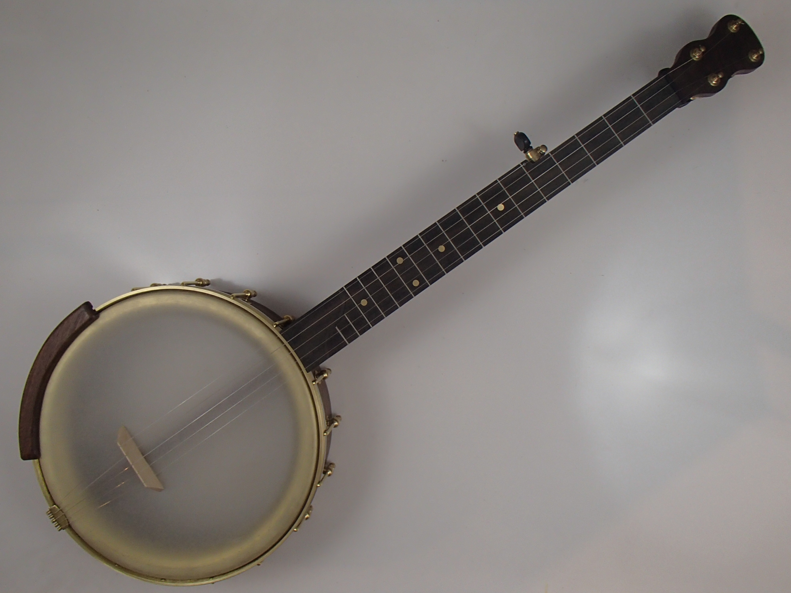 This banjo has a walnut rim, neck and Romero-style armrest, a slightly streaky ebony fretboard, and raw brass hardware. The wood has a Tru Oil finish. I will sell the banjo without the armrest for $35 less. The 12″ rim came from Nordic Shells and is 5/16″ thick, with a walnut rim cap. The rim is topped by a 1/4″ round brass tone hoop and a Dobson tone ring. The head is a Renaissance, and I can exchange it for a Fiberskyn at no charge. I made the Van Eps style tension hoop, the round tone hoop, and the dowel stick yoke. The head, tailpiece, strings, and Gotoh tuners came from Smakula Fretted Instruments and the Dobson tone ring came from Balsam Banjo Works. The hooks, nuts, and shoes came from Ode Banjos. The brass plate on the dowel stick has my name, the banjo number, and the town and year of production. There is a two way truss rod in the neck, accessed from the heel. The scale length is 25-1/2″, and the nut is 1-3/8″ wide and made from Corian. The 5th string nut is tall, to keep all the strings in the same plane, but I can shorten it so the 5th string rests on the 5th fret if you prefer. I can add 5th string spikes for $5 each. If you want a case I can send the banjo in a Superior CD-1536 or CD-2536 for $175. It is also fine to ship the banjo without a case if you don’t want one. To see a short video demonstration of this banjo please follow the link below:
