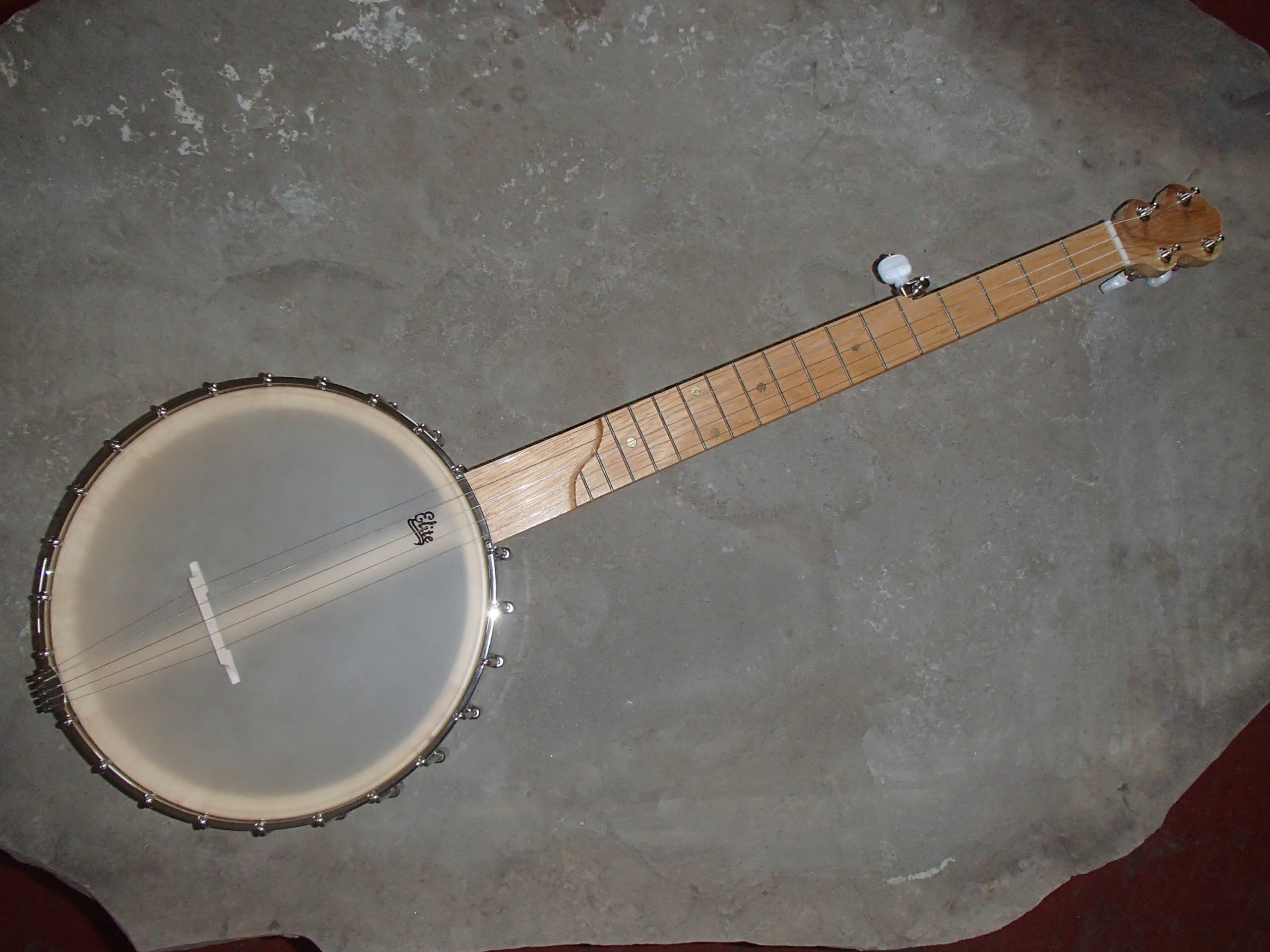 This banjo is the first I have made with nickel-plated hardware for a while. The wood is curly maple with a hickory neck stripe, fretboard, peghead overlay and heel cap. The hardware is nickel plated and came from Elderly Instruments and Stew-Mac except for the shoe bolts which are stainless steel. The scale length is 26-3/16″, the nut width is 1-3/8″ and the rim diameter is 11″. The tuners are 5 Star, the head is an Elite Amber. There is a two way truss rod in the neck, accessible through the heel. The nut is Corian. To see a video demonstration of this banjo please follow the link below.