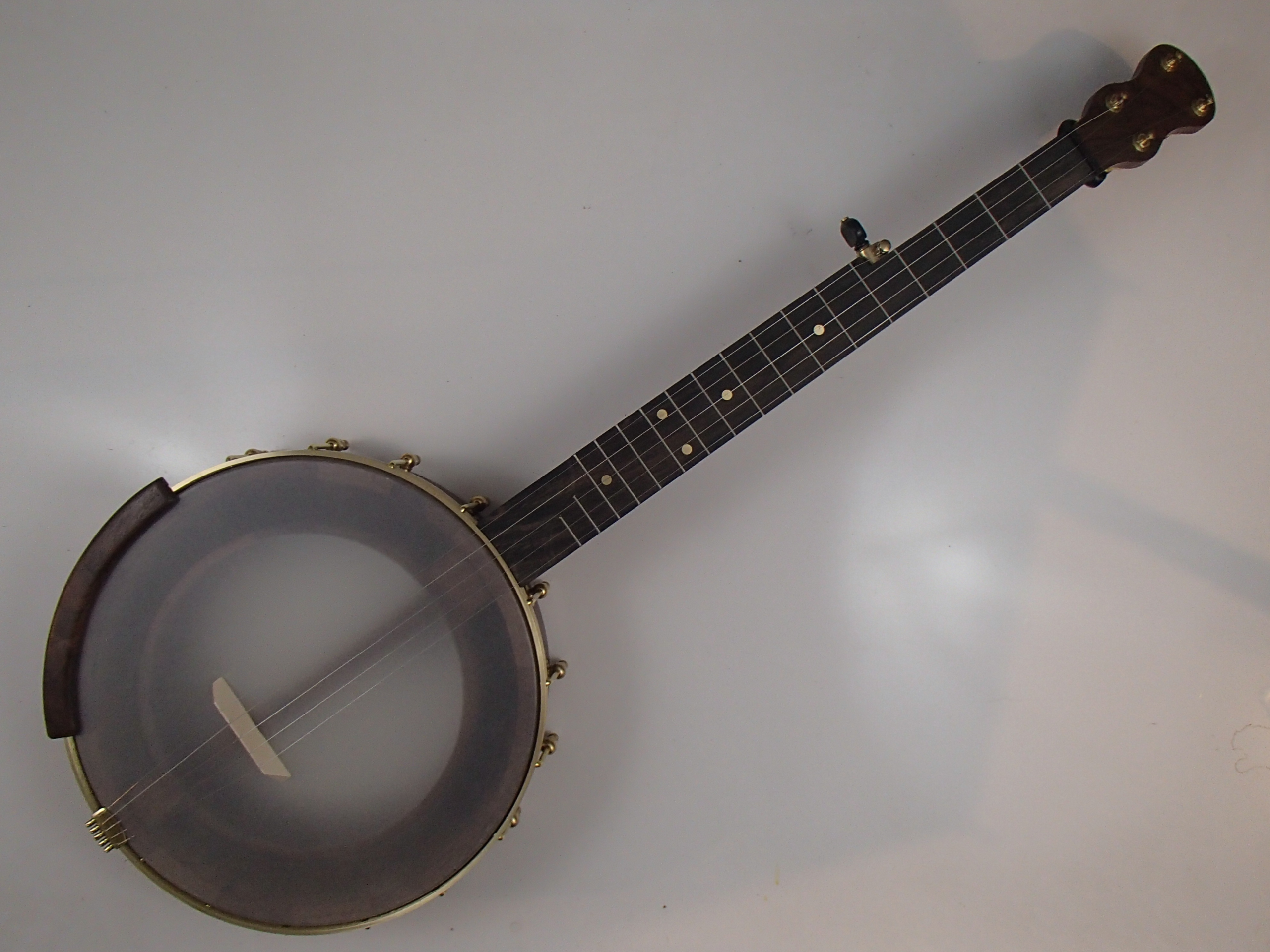 This banjo has a walnut rim, internal resonator, neck, and Romero-style armrest, a streaky ebony fretboard and raw brass hardware. The wood has a Tru Oil finish. I will sell the banjo without the armrest for $35 less. The 12″ block rim has a wood tone ring profile on top. The head is a Renaissance, and I can exchange it for a Fiberskyn at no charge. I made the Van Eps style tension hoop, the tone ring, and the dowel stick yoke. The head, tailpiece, strings, and Gotoh tuners came from Smakula Fretted Instruments and the rest of the hardware came from Ode Banjos. The brass plate on the dowel stick has my name, the banjo number, and the town and year of production. There is a two way truss rod in the neck, accessed from the heel. The scale length is 25-1/2″, the nut is 1-3/8″ wide and made from Corian, and the frets are nickel silver. The 5th string nut is tall, to keep all the strings in the same plane, but I can shorten it so the 5th string rests on the 5th fret if you prefer. I can add 5th string spikes for $5 each. If you want a case I can send the banjo in a Superior CD-1536 or CD-2536 for $175. It is also fine to ship the banjo without a case if you don’t want one. To see a short video demonstration of this banjo please follow the link below: