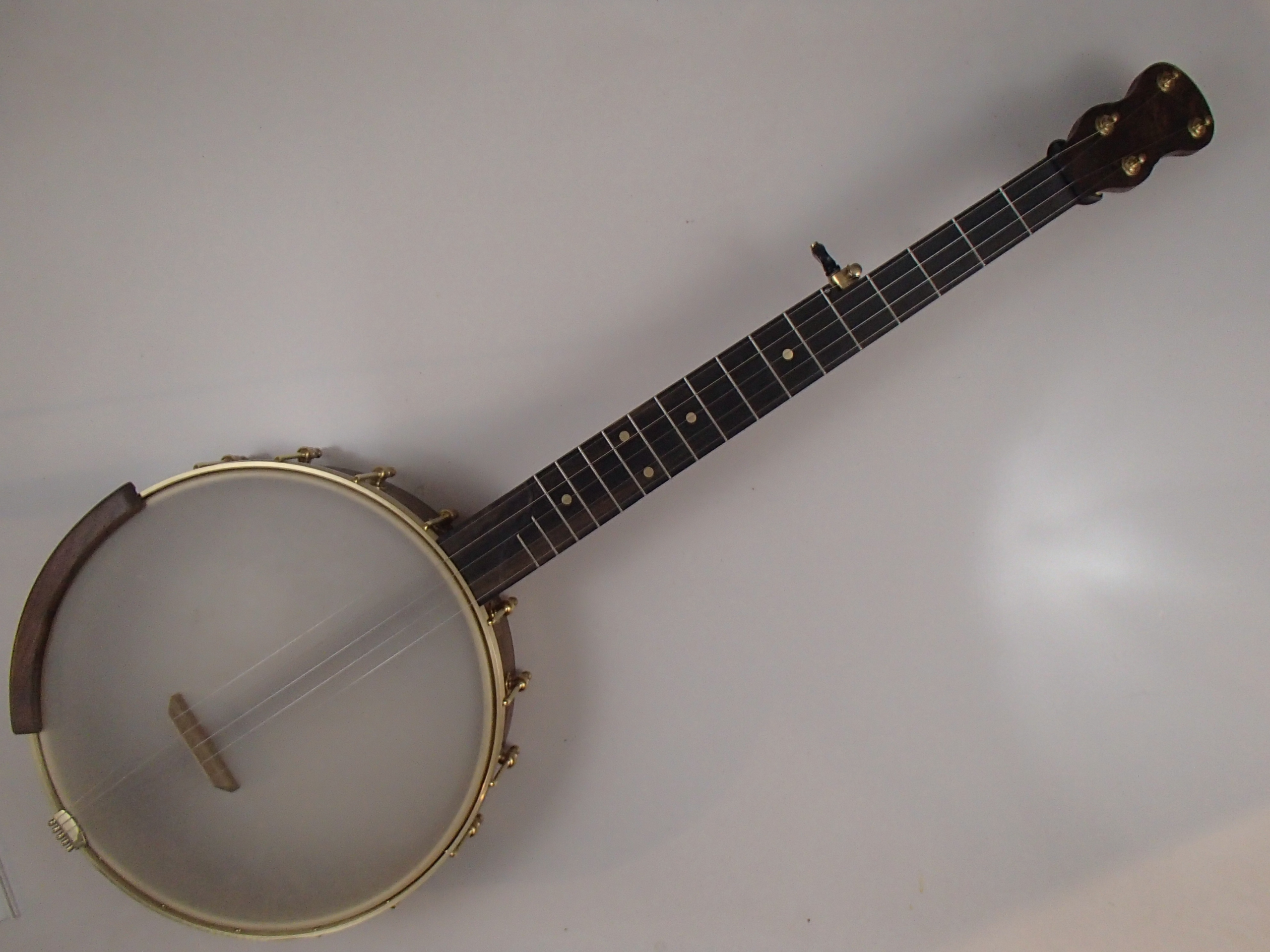 This banjo has a walnut rim, neck and Romero-style armrest, a streaky ebony fretboard, and raw brass hardware. The wood has a Tru Oil finish. I will sell the banjo without the armrest for $35 less. The 12″ block rim has a brass Whyte Laydie/Electric type tone ring. The head is a Renaissance, and I can exchange it for a Fiberskyn at no charge. I made the Van Eps style tension hoop, the tone ring, and the dowel stick yoke. The head, tailpiece, strings, and Gotoh tuners came from Smakula Fretted Instruments and the hooks, nuts, shoes and endbolt came from Ode Banjos. The brass plate on the dowel stick has my name, the banjo number, and the town and year of production. There is a two way truss rod in the neck, accessed from the heel. The scale length is 25-1/2″, and the nut is 1-3/8″ wide and made from Corian. The 5th string nut is tall, to keep all the strings in the same plane, but I can shorten it so the 5th string rests on the 5th fret if you prefer. I can add 5th string spikes for $5 each. If you want a case I can send the banjo in a Superior CD-1536 or CD-2536 for $175. It is also fine to ship the banjo without a case if you don’t want one. To see a short video demonstration of this banjo please follow the link below: