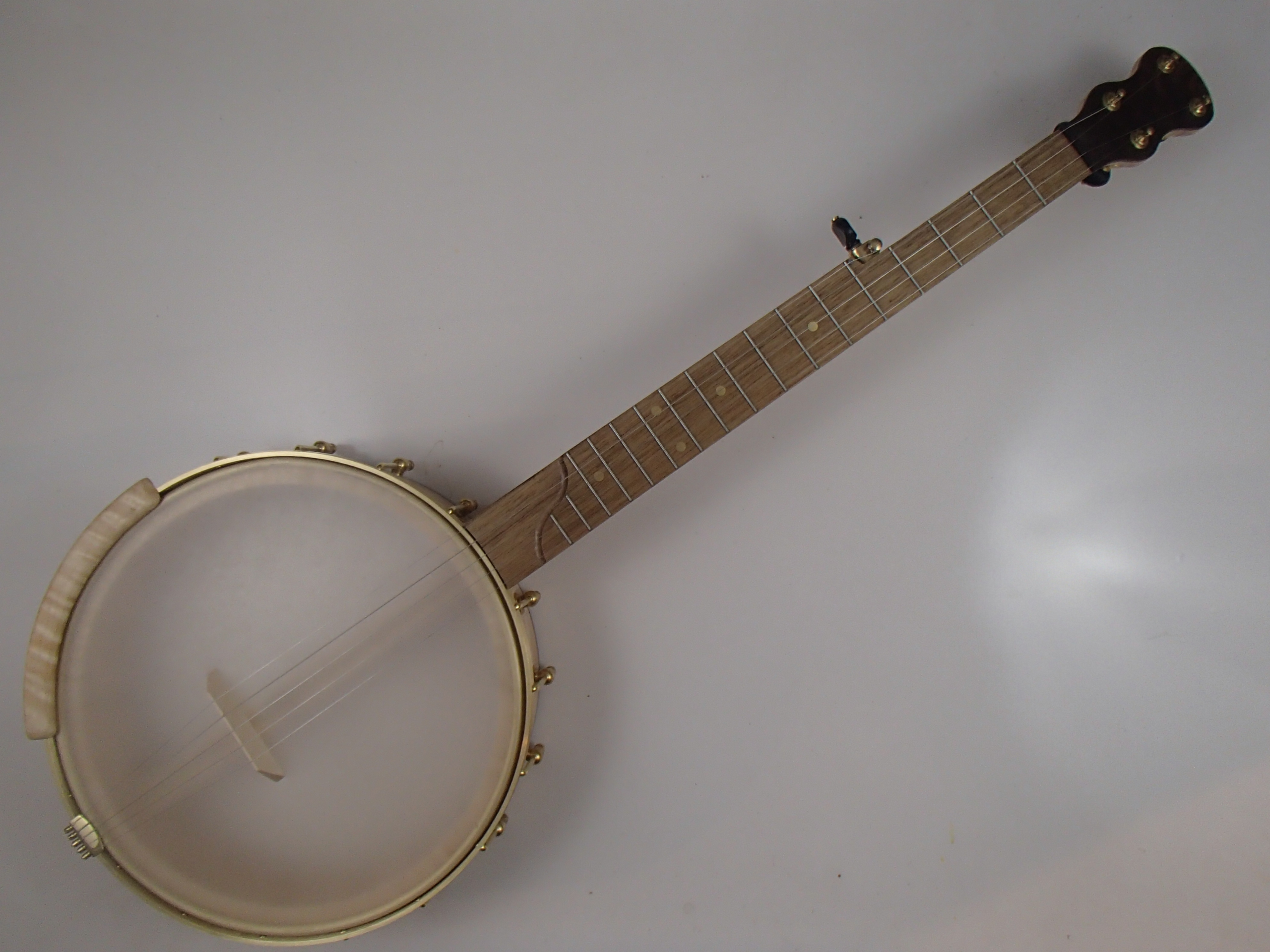 This banjo has a curly maple rim, neck and Romero-style armrest, walnut trim, a persimmon fretboard, and raw brass hardware. The 12″ block rim has a 1/4″ round brass tone hoop on top. The wood has a Tru Oil finish. I will sell the banjo without the armrest for $35 less. The head is a Renaissance, and I can exchange it for a Fiberskyn at no charge. I made the Van Eps style tension hoop, the tone ring, and the dowel stick yoke. The head, tailpiece, strings, and Gotoh tuners came from Smakula Fretted Instruments and the hooks, nuts, shoes and endbolt came from Ode Banjos. The brass plate on the dowel stick has my name, the banjo number, and the town and year of production. There is a two way truss rod in the neck, accessed from the heel. The scale length is 25-1/2″, and the nut is 1-3/8″ wide and made from Corian. The 5th string nut is tall, to keep all the strings in the same plane, but I can shorten it so the 5th string rests on the 5th fret if you prefer. I can add 5th string spikes for $5 each. If you want a case I can send the banjo in a Superior CD-1536 or CD-2536 for $175. It is also fine to ship the banjo without a case if you don’t want one. To see a short video demonstration of this banjo please follow the link below: