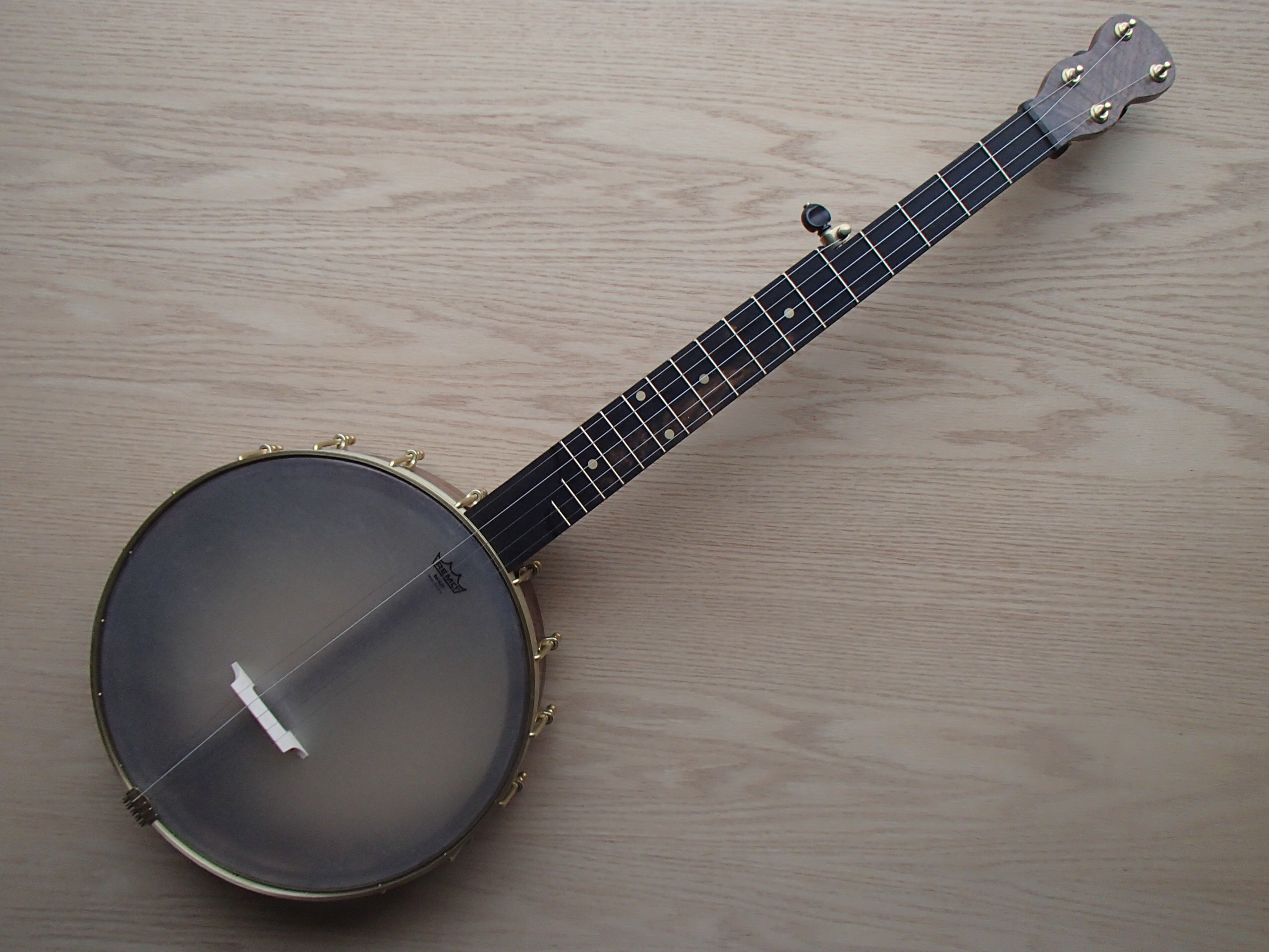 This banjo has a 12″ walnut rim, 5/8″ thick with a wood tone ring profile on the top of the rim and a Renaissance medium crown head.  I made the brass tension hoop which is Van Eps style with holes instead of notches, and this is my first one to use a silver-soldered joint instead of a plate with screws to hold the ends together.  The neck has a 1-3/8″ wide Corian nut, bone 5th string nut, naturally multicolored  ebony fretboard with scoop, EVO Gold fretwire and brass position dots.  The peghead overlay is a piece of curly walnut. There is a two way truss rod accessed through the heel as on all of my banjos.   The tuners are Gotoh raw brass.  All the rest of the brass hardware came from Balsam Banjo Works except the tailpiece.  The scale length is 25-1/2″.  To see a video demo of this banjo please follow the link below: