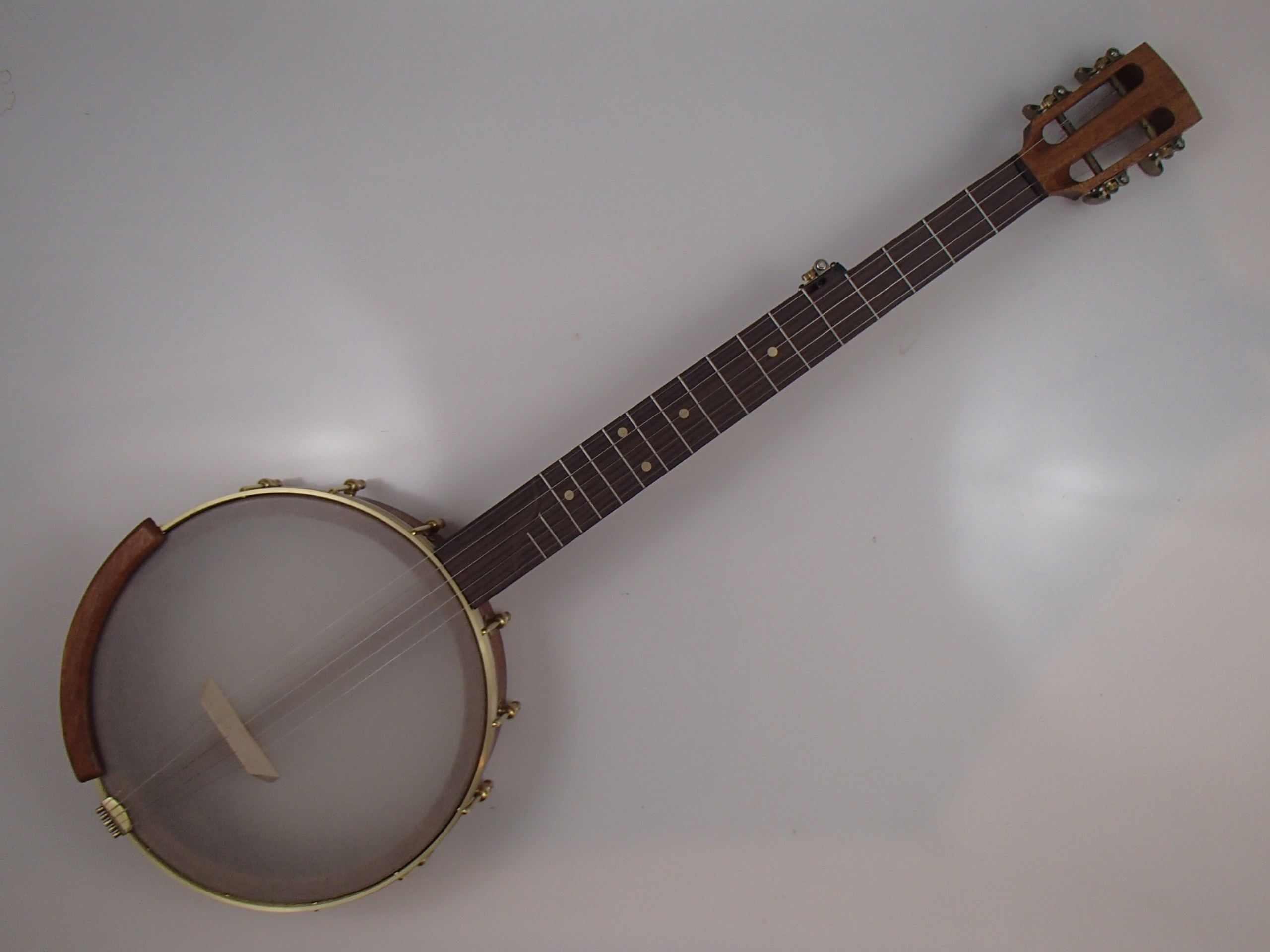 This banjo is made from African (khaya) mahogany with a rosewood fretboard. I will sell the banjo without the Romero-style armrest for $30 less. The rim is 11″ with a wood tone ring profile, the scale length is 25.5″ and the nut width is 1-3/8″. The banjo has brass right angle tuners and a two way truss rod in the neck, accessed at the heel. The dots are brass, and the nut is Corian. The Renaissance head and No-Knot tailpiece came from Smakula Fretted Instruments, I made the dowel stick yoke and Van Eps style tension hoop myself and the rest of the hardware came from Ode Banjos. There is a brass plate on the dowel stick with my name, the town and year of production and the banjo number on it. I can install a Fiberskyn head on this banjo at no cost, and I can put in fretboard spikes for $5 each. If you’d like a case I can ship this banjo in a Superior CD-1535 ‘bump’ case for $175. To see a short video demo please follow the link below: