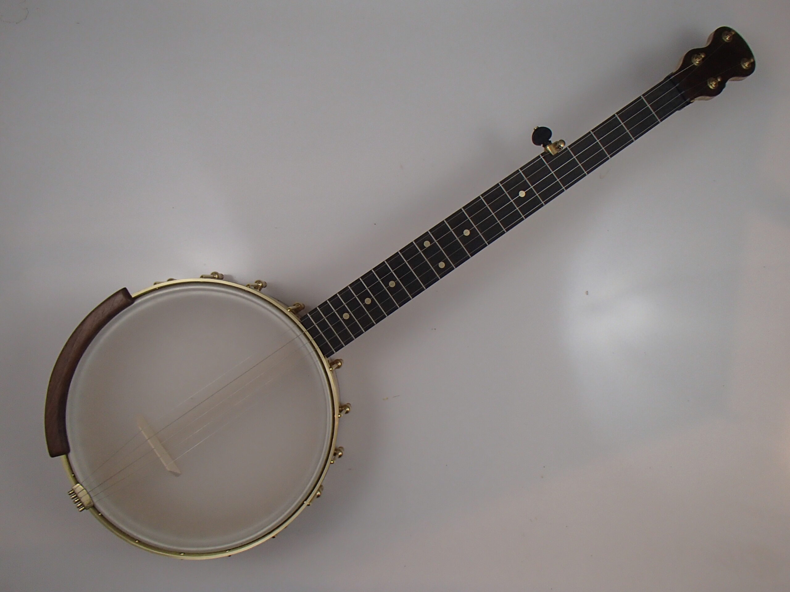 The wood is curly maple with walnut trim and an ebony fretboard. The nut width is 1-3/8″ and the scale length is 25.5″ There is a two way truss rod in the neck which is accessed from the heel, after removing the neck. The dots are brass and the nut and pip are Corian. The banjo has a Tru Oil finish