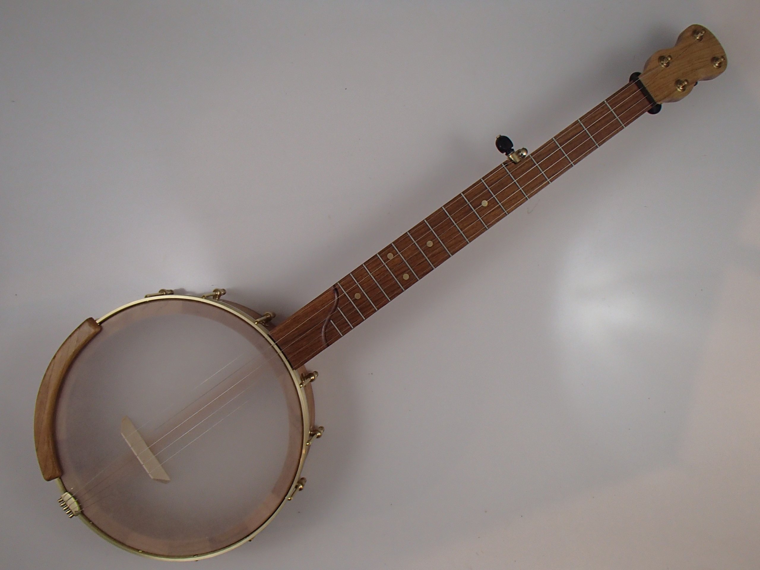 This banjo has a cherry rim, neck and Romero-style armrest with a jatoba fretboard and raw brass hardware. The wood has a Tru Oil finish. I will sell the banjo without the armrest for $30 less. The 11″ block rim has a wood tone ring profile turned into the top. The head is a Renaissance, and I can exchange it for a Fiberskyn at no charge. I made the Van Eps style tension hoop and the dowel stick yoke. The head, tailpiece, strings, and Gotoh tuners came from Smakula Fretted Instruments and the hooks, nuts, shoes and endbolt came from Ode Banjos. The brass plate on the dowel stick has my name, the banjo number, and the town and year of production. There is a two way truss rod in the neck, accessed from the heel. The scale length is 25-1/2″, and the nut is 1-3/8″ wide and made from Corian. The 5th string nut is tall, to keep all the strings in the same plane, but I can shorten it so the 5th string rests on the 5th fret if you prefer. I can add 5th string spikes for $5 each. If you want a case I can send the banjo in a Superior CD-1535 for $175. It is also fine to ship the banjo without a case if you don’t want one. To see a short video demonstration of this banjo please follow the link below: