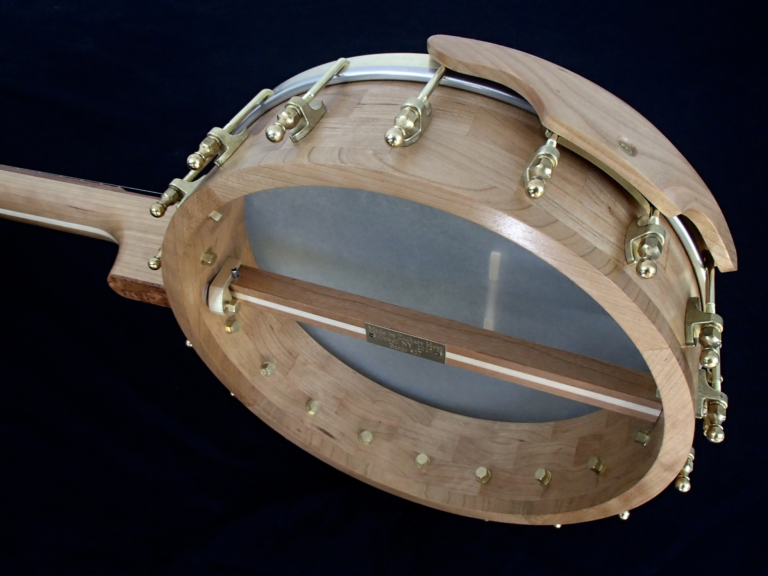 This banjo is similar to the other cherry 12s I have made, except that it has a maple stripe in the neck and dowel stick, and comes with an armrest. I will sell the banjo without the armrest for $30 less if the armrest isn’t wanted. This banjo has a Renaissance head on a 12″ rim, 3-1/8″ deep and 1/2″ thick with a cherry rim cap and a wood tone ring profile. The scale length is 25-1/2″ and the nut is 1-3/8″ wide. There is a two way truss rod in the neck, accessed from the heel, the fretboard is jatoba with brass dots, EVO fret wire, Gotoh tuners and Corian nuts, and the peghead overlay and heel cap are cherry burl. I made the Van Eps style tension hoop and the dowel stick yoke, the tailpiece and head came from Smakula Fretted Instruments and the rest of the hardware came from Balsam Banjo Works. The finish is Tru Oil. To see a video of this banjo please follow the link below: