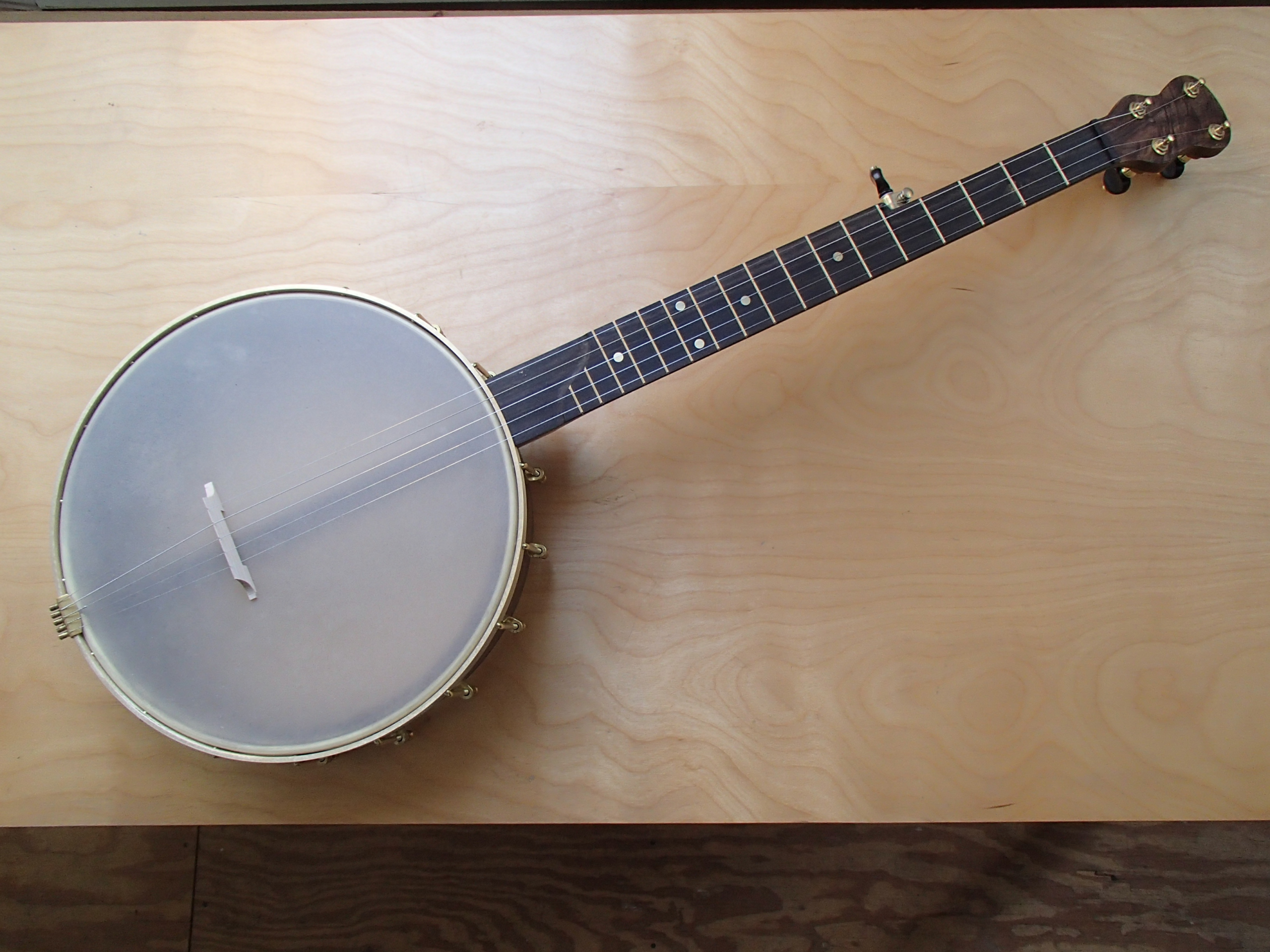 This is my first banjo that doesn’t have either a round brass tone hoop or a wood tone ring profile turned into the top of the rim. I’ve been fitting tone rings to custom rims for other people for years, but I didn’t try making my own banjo with one till now. This is also the first Whyte Laydie/Electric style tone ring I have made, now that I have a ring roller. I will have tone rings for sale by themselves soon, on the Parts page at hoytbanjos.com and at BanjoHangout. The tone ring has a scalloped truss with a 1/4″ round rod on top, just like any WL/Electric tone ring, but it does not have the thin metal skirt that covers the outside of the original tone rings since I am not able to make them and they were primarily meant to address the wetness of newly applied skin heads according to what I have been told. This banjo’s design is the same as my last banjo, #58, except that #59 has an ebony fretboard instead of rosewood. It has a 25.5″ scale length, curly walnut peghead overlay, EVO fret wire, two way truss rod accessed through the neck heel, 12″ pot with a curly walnut rim cap, and brass hardware. I made the Van Eps style tension hoop, and the dowel stick brace. The Renaissance head and No-Knot tailpiece came from Smakula Fretted Instruments and the rest of the hardware came from Balsam Banjo Works. The tuners are Gotoh raw brass. To see a video comparing the sound of #s 58 and 59 please follow the link below: