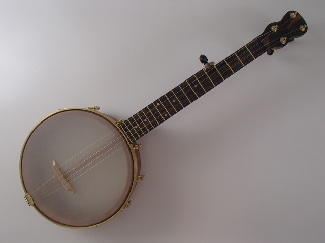 This is my 5th C scale banjo, it’s made from African mahogany (khaya family) with an ebony peghead overlay, heel cap and fretboard. The frets are EVO and the nuts are Corian. The scale length is 19-3/4″ and the nut width is 1-3/8″. There is a two way truss rod accessed at the heel of the neck. I made the Van Eps style tension hoop and the dowel stick brace, the head and tailpiece came from Smakula Fretted Instruments and the balance of the hardware is from Balsam Banjo Works. The finish is Tru Oil. The overall length is slightly under 30″ and weight is approximately 3 pounds 12 ounces. To see a video demonstration of this banjo please follow the link below: