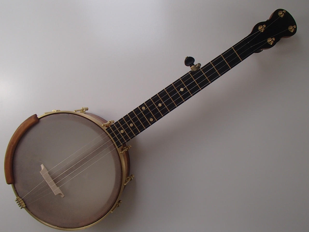 This C scale banjo is made from a few different colors of African mahogany (khaya family) that I had on hand, with an ebony peghead overlay, heel cap and fretboard. I will sell it without the armrest for $35 less. The frets are EVO and the nuts are Corian. The scale length is 19-3/4″ and the nut width is 1-3/8″. There is a two way truss rod accessed at the heel of the neck. I made the Van Eps style tension hoop and the dowel stick brace, the head and tailpiece came from Smakula Fretted Instruments and the balance of the hardware is from Balsam Banjo Works. The finish is Tru Oil. The overall length is slightly under 30″ and weight is approximately 3 pounds 14 ounces. To see a video demonstration of this banjo please follow the link below: