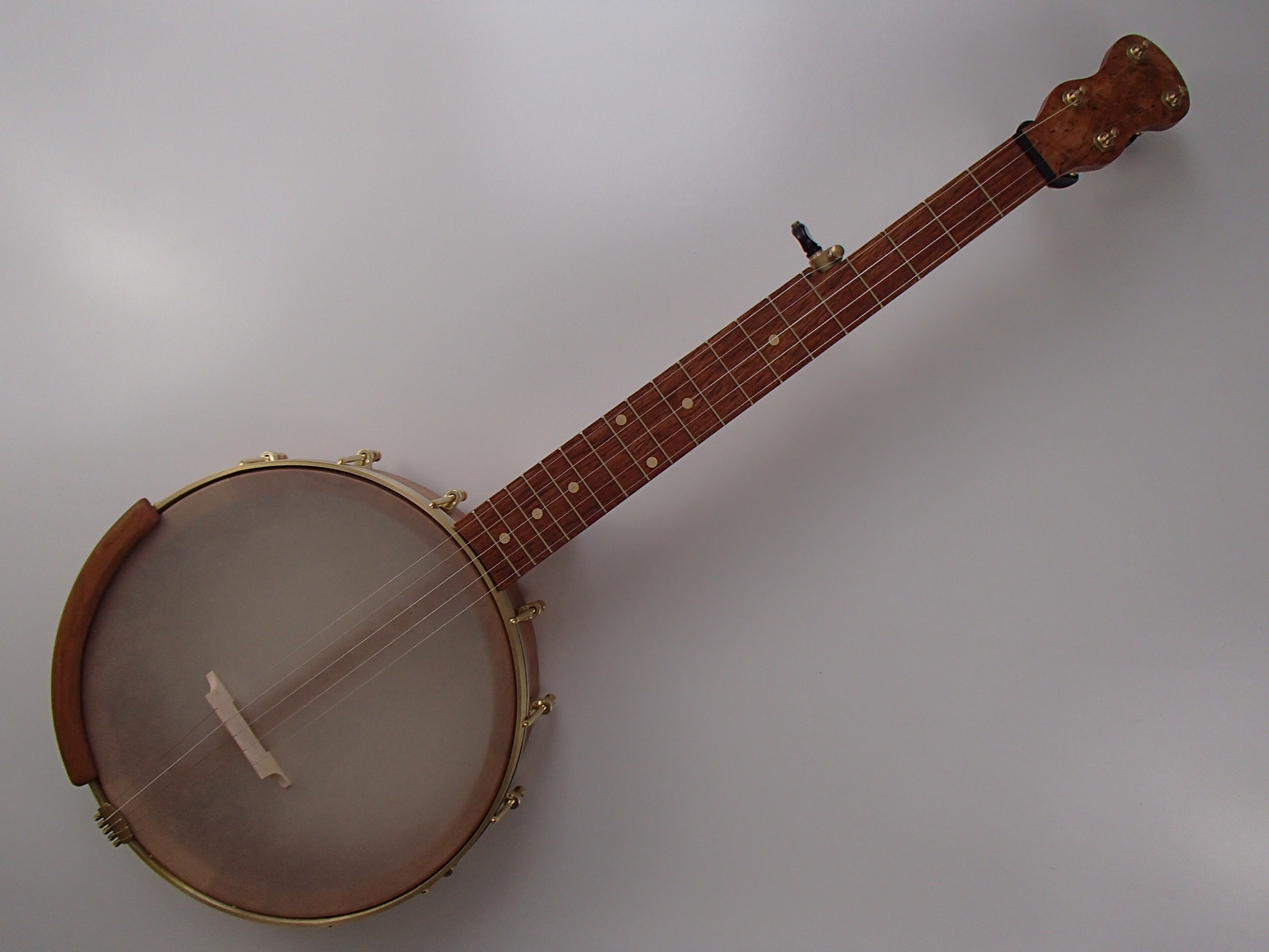 The neck, rim, rim cap and Romero-style armrest are made from cherry, the peghead overlay and heel cap are cherry burl, and the fretboard is jatoba.   I will sell the banjo without the armrest for $30 less.  The scale length is 23″ and the nut width is 1-3/8″.   There is a two way truss rod accessed at the heel of the neck, the fretboard marker dots are brass, the nuts are Corian, the fret wire is EVO Gold and the tuners are Gotoh.  The rim has a wood tone ring profile turned into the top.  I made the Van Eps style tension hoop and the dowel stick brace,  the Renaissance head and the tailpiece came from Smakula Fretted Instruments and the rest of the hardware is from Balsam Banjo Works.  The finish is Tru Oil.  To see a video demonstration of this banjo please follow the link below: