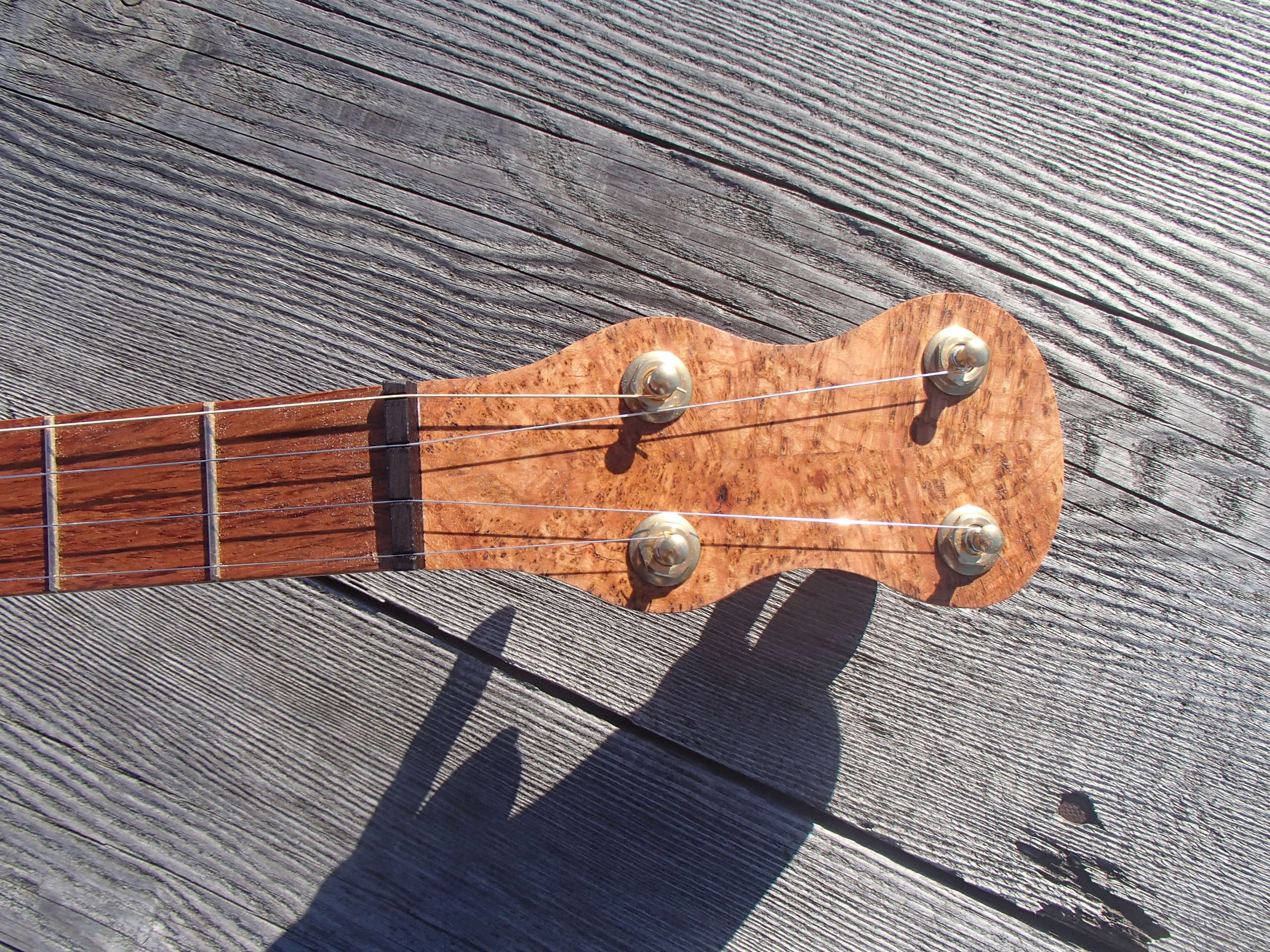 This is my 35th banjo, completed in October 2016. It’s a 12″ pot with a wood tone ring profile turned into the top of the rim, a Renaissance head and raw brass hardware. I made the Van Eps style tension hoop myself, and the rest of the hardware was bought. The scale length is 25.5 inches and the fretboard is jatoba from a board with more streaks than what I have used before. I wasn’t sure it was jatoba after I bought it but I sent a sample to the US Forest Products Service lab and they confirmed it. I used the streaky wood to sort of match with the peghead, which is a bookmatched slice from a cherry burl. The nut width is 1-3/8″, position dots are brass and the frets are EVO Gold, which is harder than conventional nickel-silver fret wire and should wear longer. There is a two way truss rod in the neck, accessed from the heel for adjustment. The tuners are Gotoh raw brass and they are, as always with Gotoh, very smooth in operation. The tailpiece is a No-Knot. The bridge is solid maple such as I usually make. The nut is Corian. I will be happy to answer any questions you may have. To see a video demo of this banjo please follow the link below to YouTube.