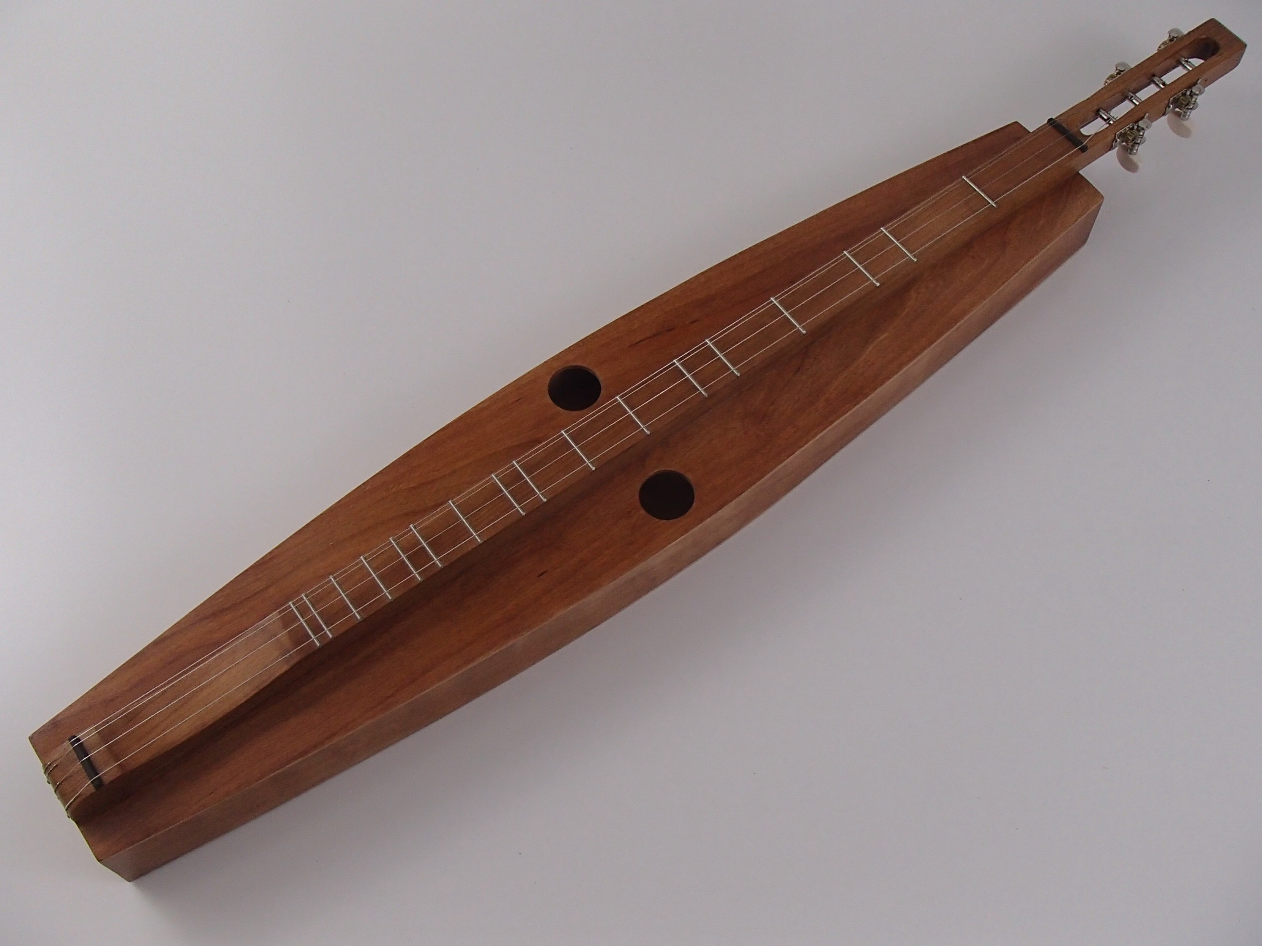 This dulcimer is made entirely from cherry wood except for the internal brace, which is pine. There is a streak of white sapwood in the edge of the back piece, it can be seen in some of the pictures. This dulcimer has four strings and a 27″ scale length. The neck is 1-1/4″ wide. The bridge and nut are ebony, and the strings are made by Martin. The finish is 5 coats of Tru Oil.